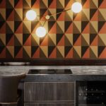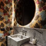 La sinergia tra le pietre naturali Antolini e l’elemento d’arredo rappresentato dalla carta da parati, leitmotiv dell’intero progetto, prosegue nei bagni. In una delle due toilette, la carta da parati del marchio inglese Cole & Son, su disegno a tema naturalistico di Fornasetti, celebra uno scenario inaspettato. La scelta dell’architetto Mario Santini si è rivolta qui al marmo Silver Roots, dove i toni delicati del grigio, a rivestimento del lavandino a parallelepipedo e della parete perimetrale, contrastano con le cromie vivaci e decise della carta da parati, generando un interior di grande fascino estetico