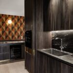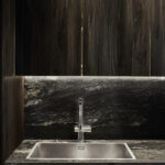 Significativa la scelta di accostare materiali diversi, sia per animare un vivace dialogo tra stili, colori e materiali, sia per caratterizzare singolarmente ogni ambiente. Protagonista della casa, la cucina diventa fulcro della vita famigliare accentrando emozioni e funzioni, diventando contemporaneamente luogo tecnico, vetrina, area privata in cui accogliere ospiti e amici. All’interno della cucina, che si affaccia sul dining, è stata creata un’isola con top interamente rivestito con l’esclusivo granito Black Cosmic in finitura Lether, sul quale sono stati inseriti il piano a induzione e un lavandino a scomparsa.