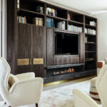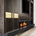 Il risultato è un ambiente sofisticato e intrigante, rigoroso e accogliente, un colpo d’occhio che non lascia spazio a percezioni sfumate. Si ritrova il granito Black Cosmic Antolini in finitura Lether anche nella zona living. Posta nella parte bassa della libreria permette l’inserzione di un camino, che diventa magico luogo di incontro tra materiali naturali ed elementi atavici come la pietra, il legno e il fuoco.