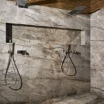 Anche il bagno padronale è arredato con il marmo Silver Roots in finitura Lether utilizzato per il piano orizzontale, i lavabi, le superfici verticali e la doccia. Ne esce uno scenario in cui il mix di elementi naturali seduce, inganna e anche diverte. La pietra di Antolini è, infatti, abbinata a un’inedita carta da parati tridimensionale di Pierre Frey che richiama il disegno delle canne di bambù, restituendo la percezione di un ambiente quasi outdoor, votato alla rigenerazione fisica e mentale.
