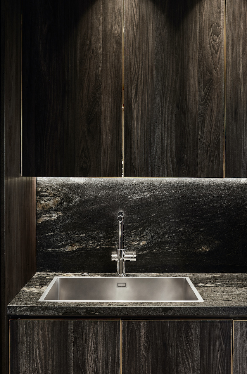 Significativa la scelta di accostare materiali diversi, sia per animare un vivace dialogo tra stili, colori e materiali, sia per caratterizzare singolarmente ogni ambiente. Protagonista della casa, la cucina diventa fulcro della vita famigliare accentrando emozioni e funzioni, diventando contemporaneamente luogo tecnico, vetrina, area privata in cui accogliere ospiti e amici. All’interno della cucina, che si affaccia sul dining, è stata creata un’isola con top interamente rivestito con l’esclusivo granito Black Cosmic in finitura Lether, sul quale sono stati inseriti il piano a induzione e un lavandino a scomparsa.