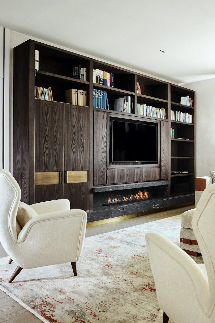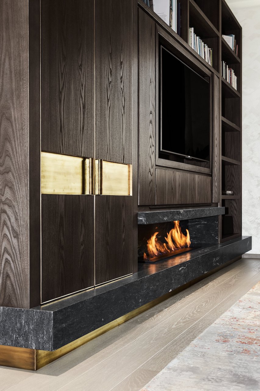 Il risultato è un ambiente sofisticato e intrigante, rigoroso e accogliente, un colpo d’occhio che non lascia spazio a percezioni sfumate. Si ritrova il granito Black Cosmic Antolini in finitura Lether anche nella zona living. Posta nella parte bassa della libreria permette l’inserzione di un camino, che diventa magico luogo di incontro tra materiali naturali ed elementi atavici come la pietra, il legno e il fuoco.