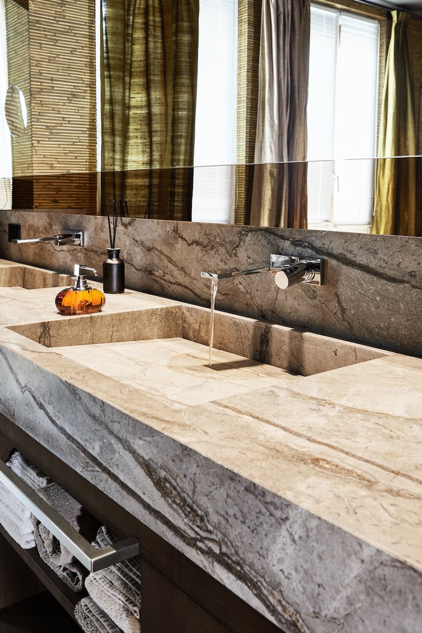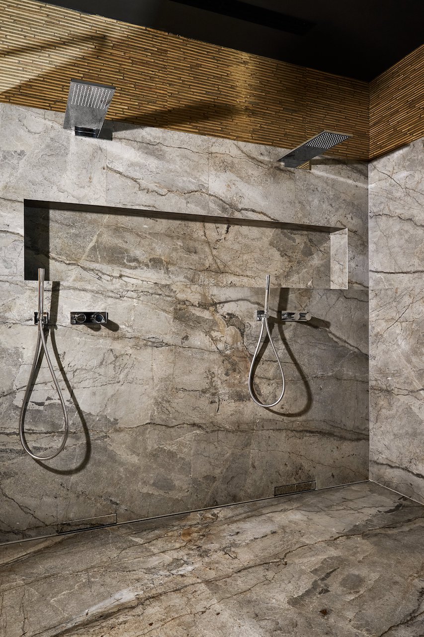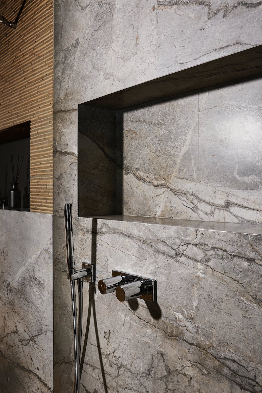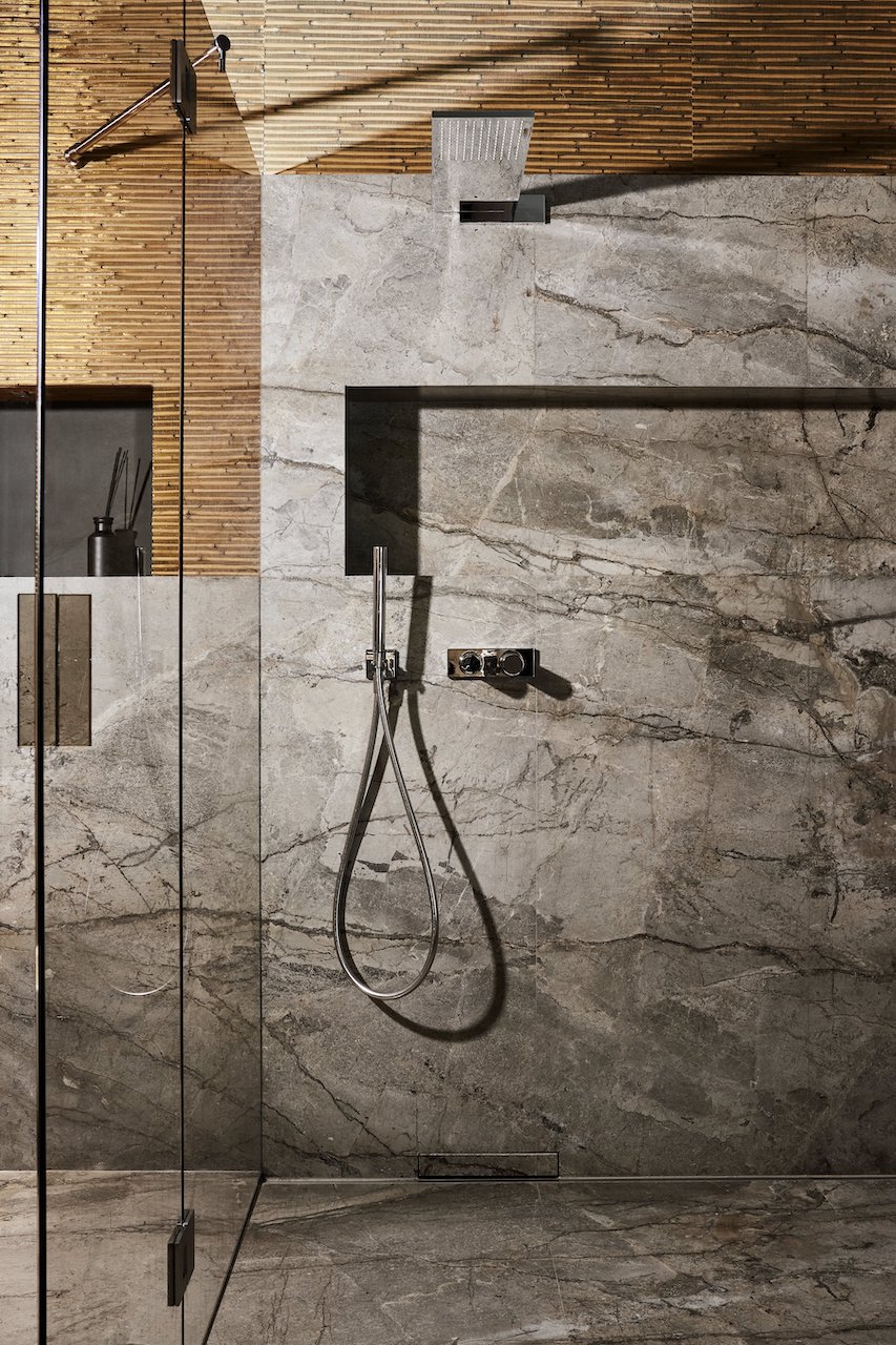 Anche il bagno padronale è arredato con il marmo Silver Roots in finitura Lether utilizzato per il piano orizzontale, i lavabi, le superfici verticali e la doccia. Ne esce uno scenario in cui il mix di elementi naturali seduce, inganna e anche diverte. La pietra di Antolini è, infatti, abbinata a un’inedita carta da parati tridimensionale di Pierre Frey che richiama il disegno delle canne di bambù, restituendo la percezione di un ambiente quasi outdoor, votato alla rigenerazione fisica e mentale.