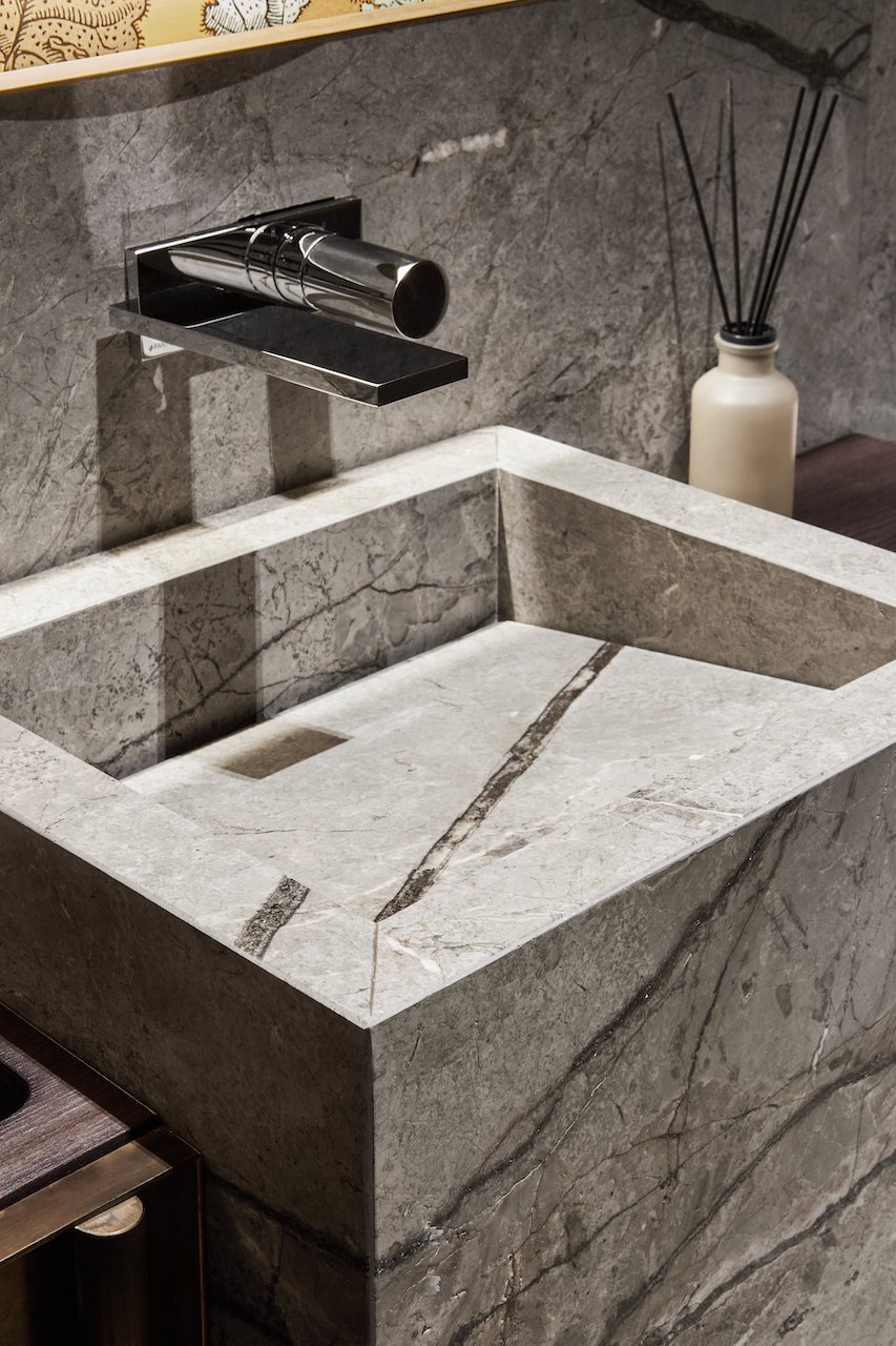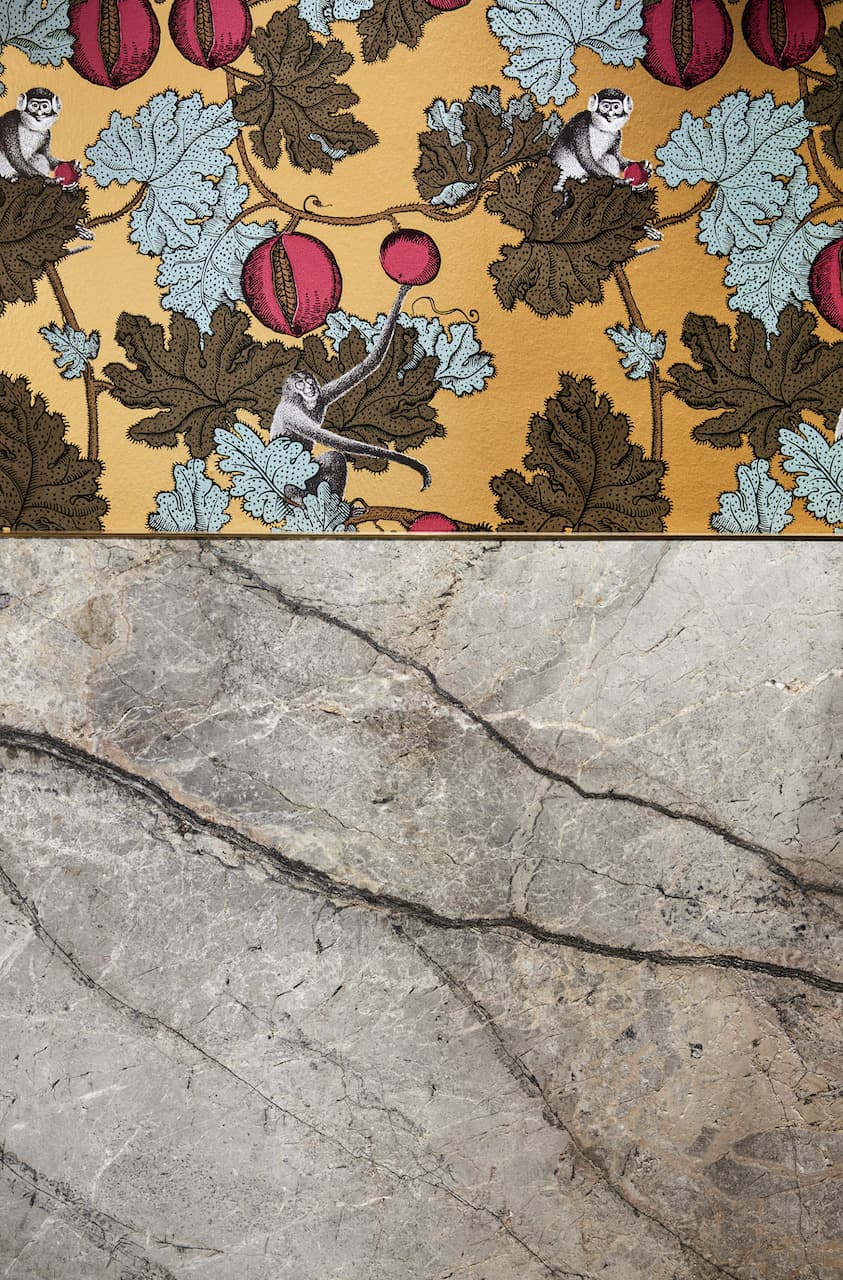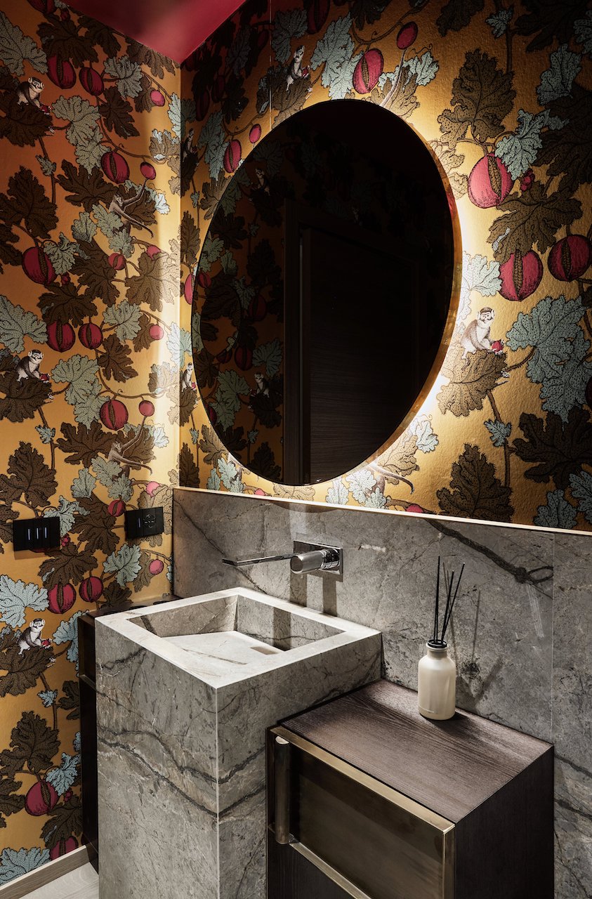 La sinergia tra le pietre naturali Antolini e l’elemento d’arredo rappresentato dalla carta da parati, leitmotiv dell’intero progetto, prosegue nei bagni. In una delle due toilette, la carta da parati del marchio inglese Cole & Son, su disegno a tema naturalistico di Fornasetti, celebra uno scenario inaspettato. La scelta dell’architetto Mario Santini si è rivolta qui al marmo Silver Roots, dove i toni delicati del grigio, a rivestimento del lavandino a parallelepipedo e della parete perimetrale, contrastano con le cromie vivaci e decise della carta da parati, generando un interior di grande fascino estetico