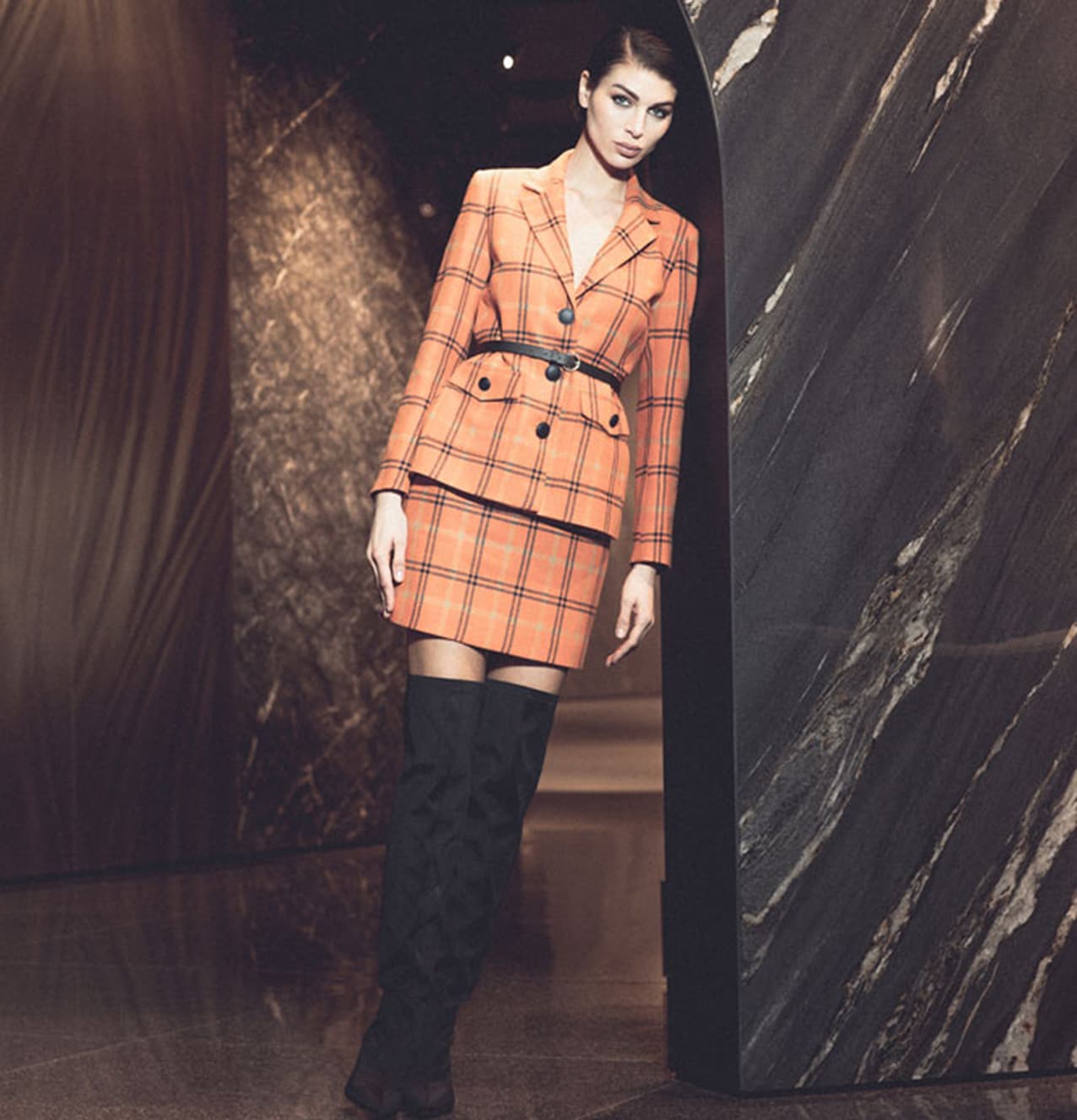 Il tailleur di lana check di Post Scriptum è un concentrato di diverse tendenze “forti”, che domineranno l’autunno/inverno. È in morbida lana check, che riporta in auge il trend da college girl. Ha una giacca chiusa da tre bottoni e con tasche applicate, che si può lasciar cadere dritta o a cui si può applicare una cintura sottile da stringere in vita per segnare la silhouette. Ha una gonna corta 100% preppy e sfodera una tonalità di arancione su cui le più attente non potranno fare a meno di puntare: meno scontata del classico rosso, sofisticata ed energetica.