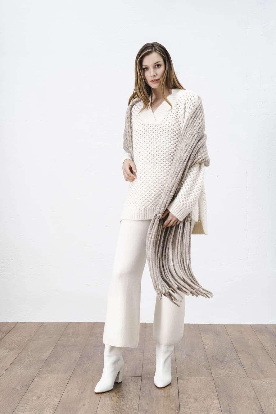 Per lei, maglia da donna con scollo a V, bianco e grigio, in alpaca, seta e lana dalla vestibilità morbida. La lavorazione è protagonista assoluta con il “punto rete” che dona un bellissimo effetto traforato. Una lavorazione dall’effetto contemporaneo e allo stesso tempo frutto di esperienza tramandata da generazioni.