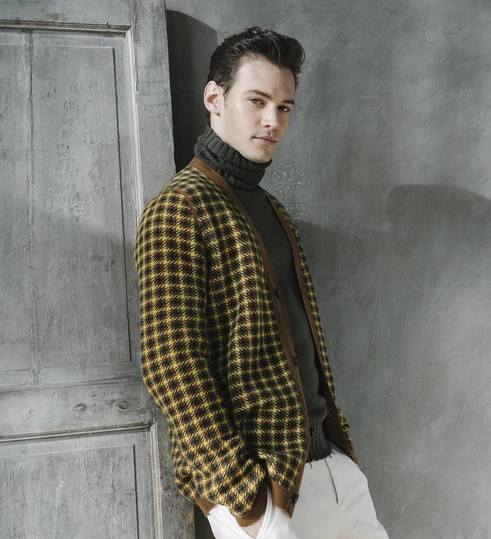 Per lui, cardigan sui toni dell’ocra e del marrone e maglione con collo alto sui toni del blu e dell’azzurro, realizzati in cashmere con una complessa lavorazione jacquard, un dettaglio unico dal gusto artigianale. La fantasia micro pied-de-poule è un omaggio alla classe senza tempo. La tecnica dello jacquard è ricca di storia e minuzia. Si tratta di una lavorazione a maglia realizzata con colori diversi in cui si ha un disegno, non ricamato bensì incorporato nel fondo.