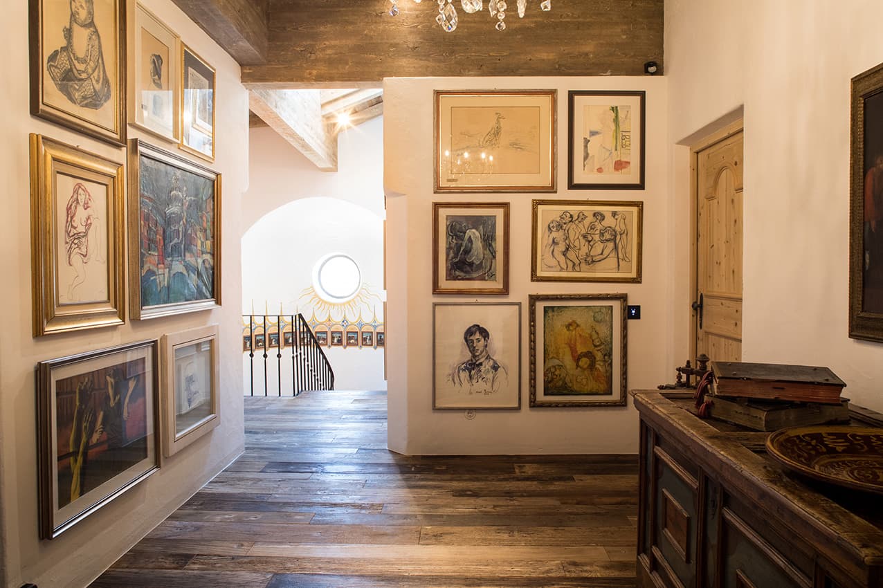 Quadri di valore inestimabile alle pareti e sculture di artisti del luogo, tra cui Hans Pattis ed Emmerich Holzknecht, danno il benvenuto agli ospiti nel bar Oswald von Wolkenstein. La sala ampia, con legno intarsiato al soffitto e pavimento in pietra altoatesina, ospita un elegante pianoforte e una tipica stufa in maiolica. È questo il primo ambiente dedicato ai piaceri del palato, tra dolci e finger food salati, cocktail, aperitivi e digestivi. Accanto la Sala del caminetto, una lounge elegante e raffinata con il camino che si mimetizza nella parete antracite, divanetti e pouf verdi e un grande quadro di Alejandro Hermann sullo sfondo che diventa immediatamente protagonista della scena.