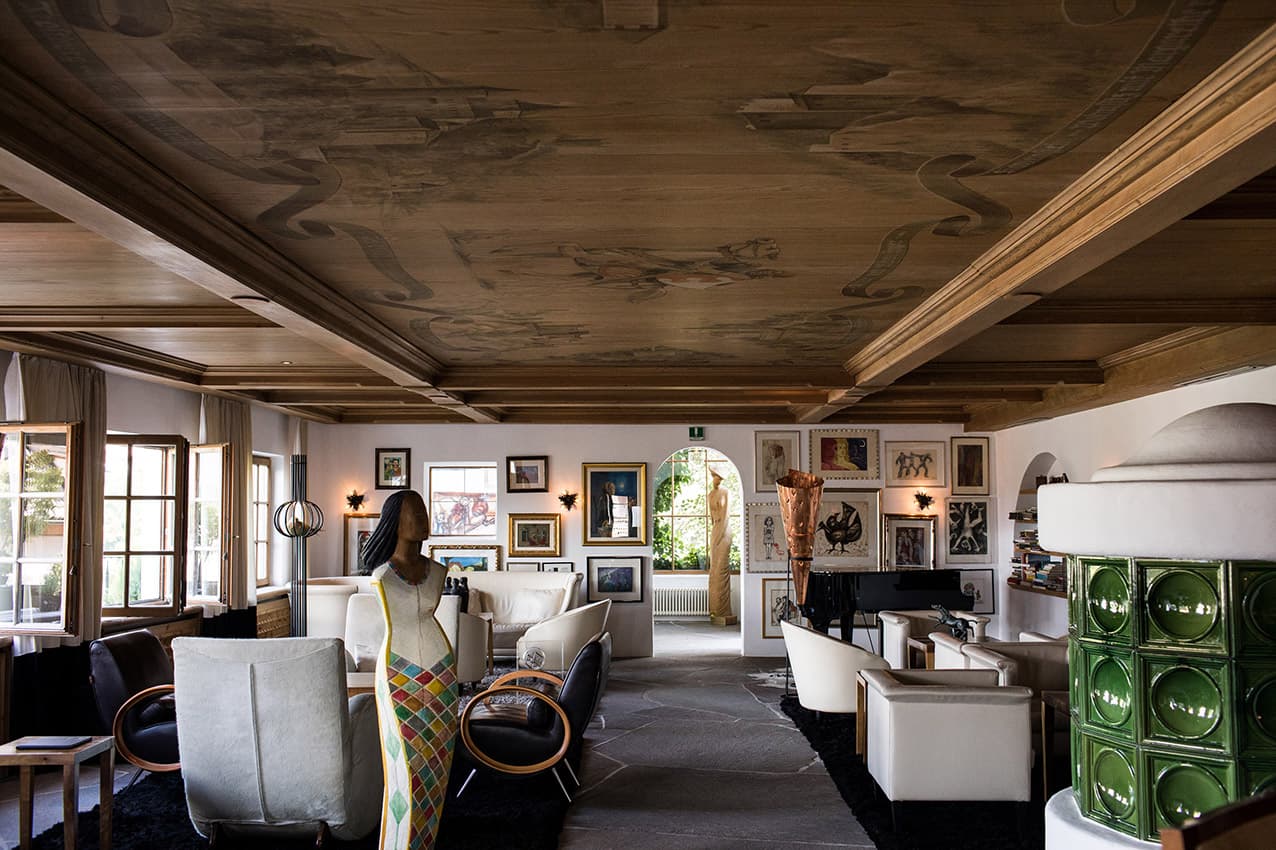 Quadri di valore inestimabile alle pareti e sculture di artisti del luogo, tra cui Hans Pattis ed Emmerich Holzknecht, danno il benvenuto agli ospiti nel bar Oswald von Wolkenstein. La sala ampia, con legno intarsiato al soffitto e pavimento in pietra altoatesina, ospita un elegante pianoforte e una tipica stufa in maiolica. È questo il primo ambiente dedicato ai piaceri del palato, tra dolci e finger food salati, cocktail, aperitivi e digestivi. Accanto la Sala del caminetto, una lounge elegante e raffinata con il camino che si mimetizza nella parete antracite, divanetti e pouf verdi e un grande quadro di Alejandro Hermann sullo sfondo che diventa immediatamente protagonista della scena.