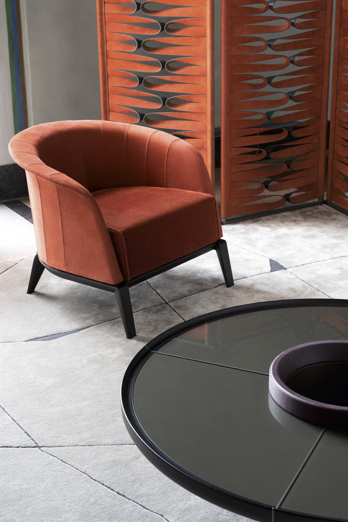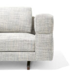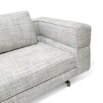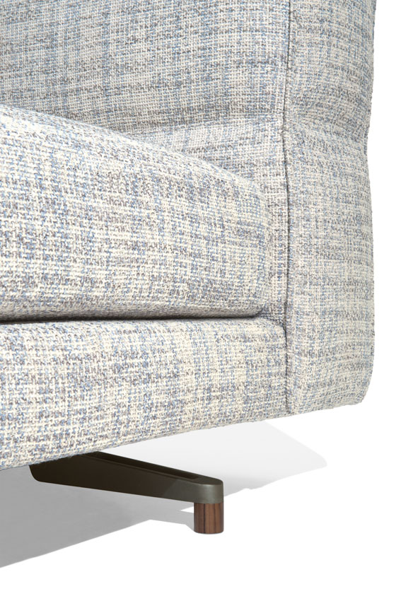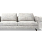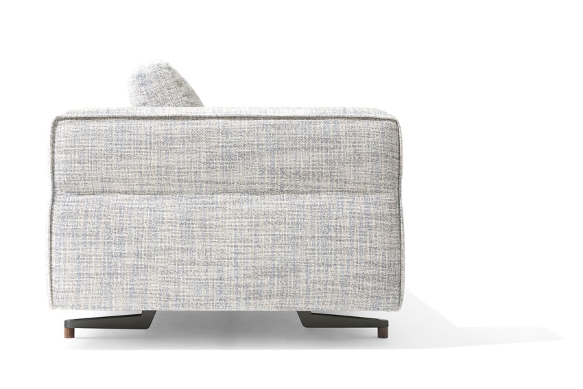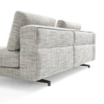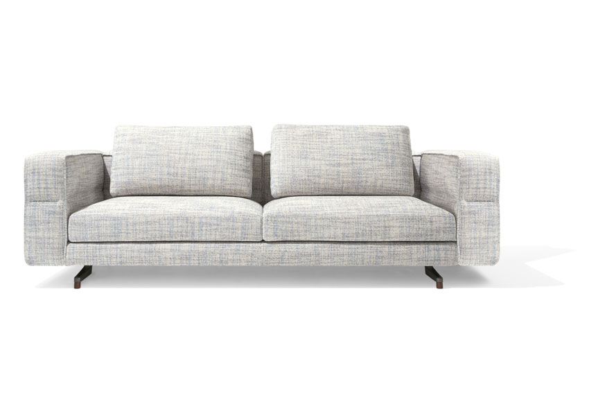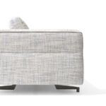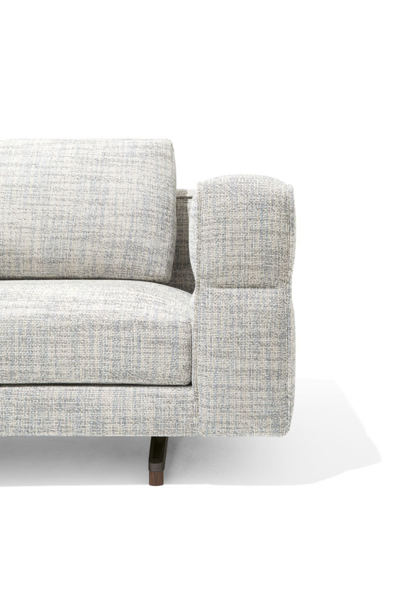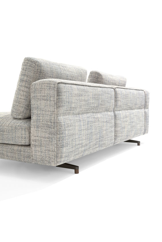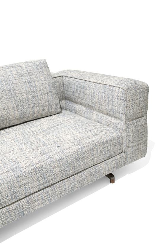 Un divano modulare, dal comfort straordinario, caratterizzato da un tratto essenziale, leggero, aereo, la cui forza risiede nella cura estrema dei particolari: dal dettaglio della cucitura che divide, disegna e trattiene il bracciolo dando vita ad un capitonné moderno; alla fettuccia che disegna il profilo di ogni elemento; ai terminali dei piedini realizzati dal recupero di scarti di produzione di Pau ferro massello, essenza rara e preziosa proveniente dal Sud America, nonché profondamente legata alle radici di Giorgetti.