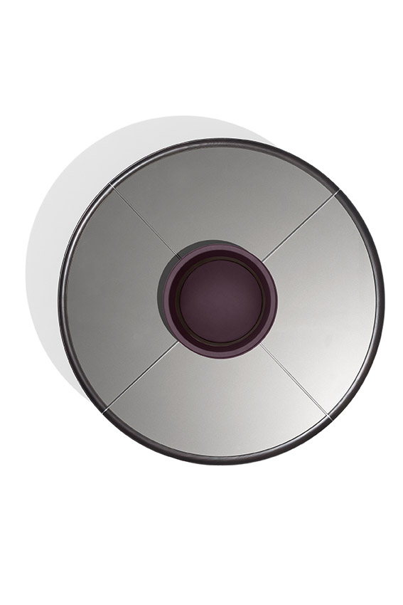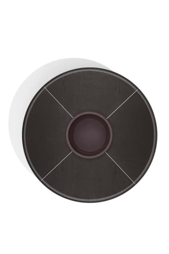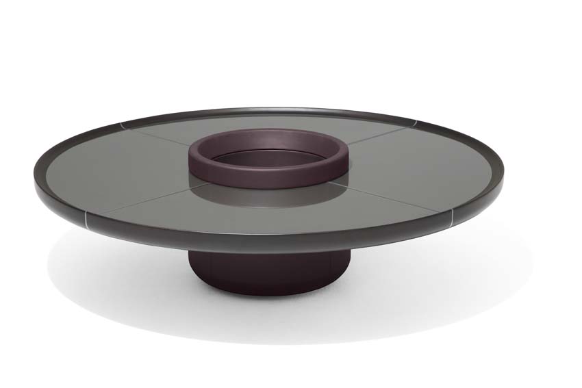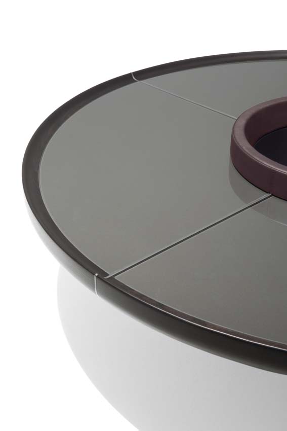 Materiali diversi si incontrano in questo progetto in un gioco di proporzioni e simmetrie che crea un effetto ottico inaspettato. Con un’estetica che si rifà al design, ma anche alla pubblicità e ai Caroselli, degli anni ’70, Ray è caratterizzato da una struttura contenitiva centrale, completamente rivestita in pelle, che sostiene un piano circolare a sbalzo composto da un bordo in massello di frassino e fughe in metallo verniciato che, come dei raggi, dividono il piano in quattro spicchi personalizzabili a scelta in frassino, vetro retro-verniciato color peltrox o pelle.