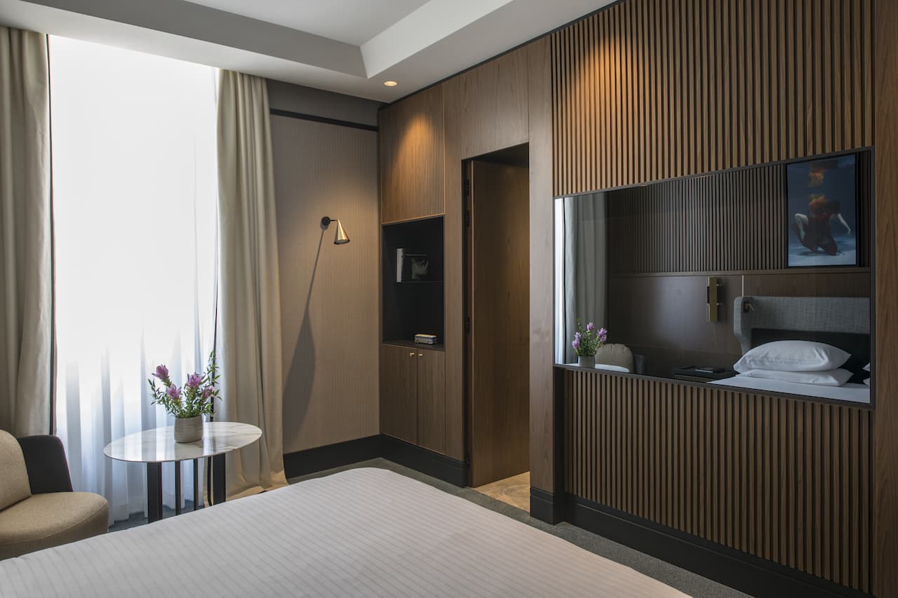 I lavori sono iniziati nell’estate del 2019 e oggi l’hotel riapre al pubblico in una nuova veste, grazie a un importante intervento architettonico, ingegneristico e di interior design che ne ha mantenuto ed esaltato tuta la storicità. La struttura si colloca all’interno di un palazzo storico che aveva precedentemente ospitato uffici direzionali e spazi commerciali e che rivela il suo tratto elegante e maestoso fin dall’ingresso, dove un bellissimo portone in legno si apre in un alto androne con volta a botte.