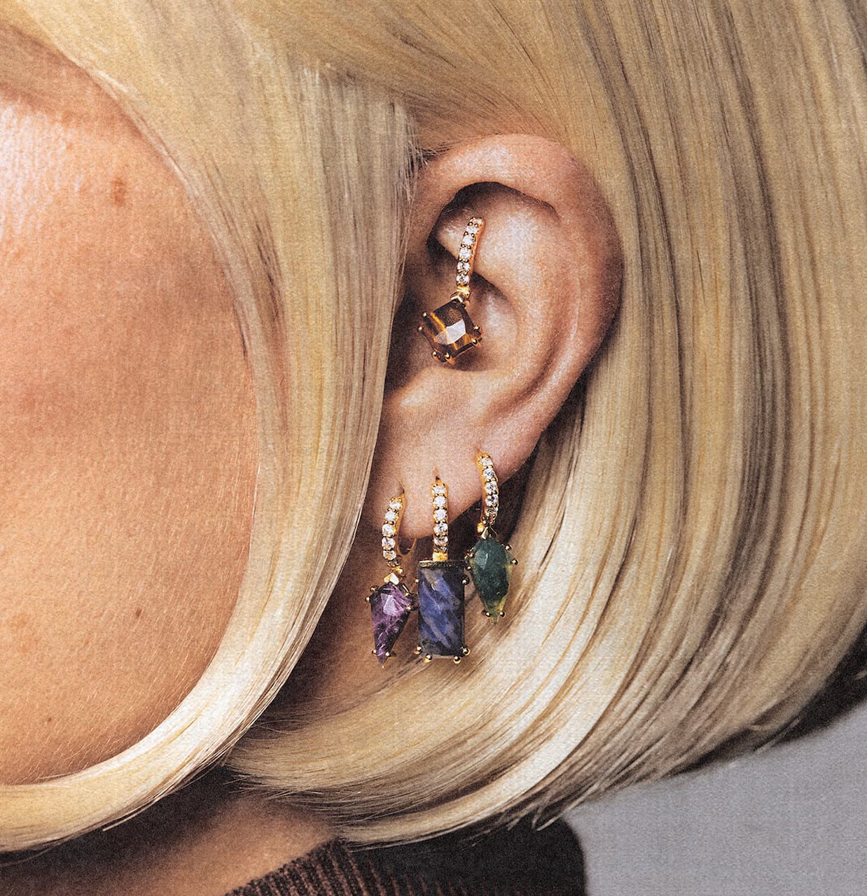 La Capsule Collection Gemstones Piercing offre la libertà di creare un look multicolor con orecchini singoli che si possono usare anche in coppia. Realizzati in argento placcato oro 18 carati, gli orecchini sono incastonati con zirconi bianchi e gemme naturali: sodalite, charoite, quarzo rutilato, occhio di tigre o agata verde. Mixare, abbinare e cambiare con facilità per creare un’identità da sogno per le orecchie.