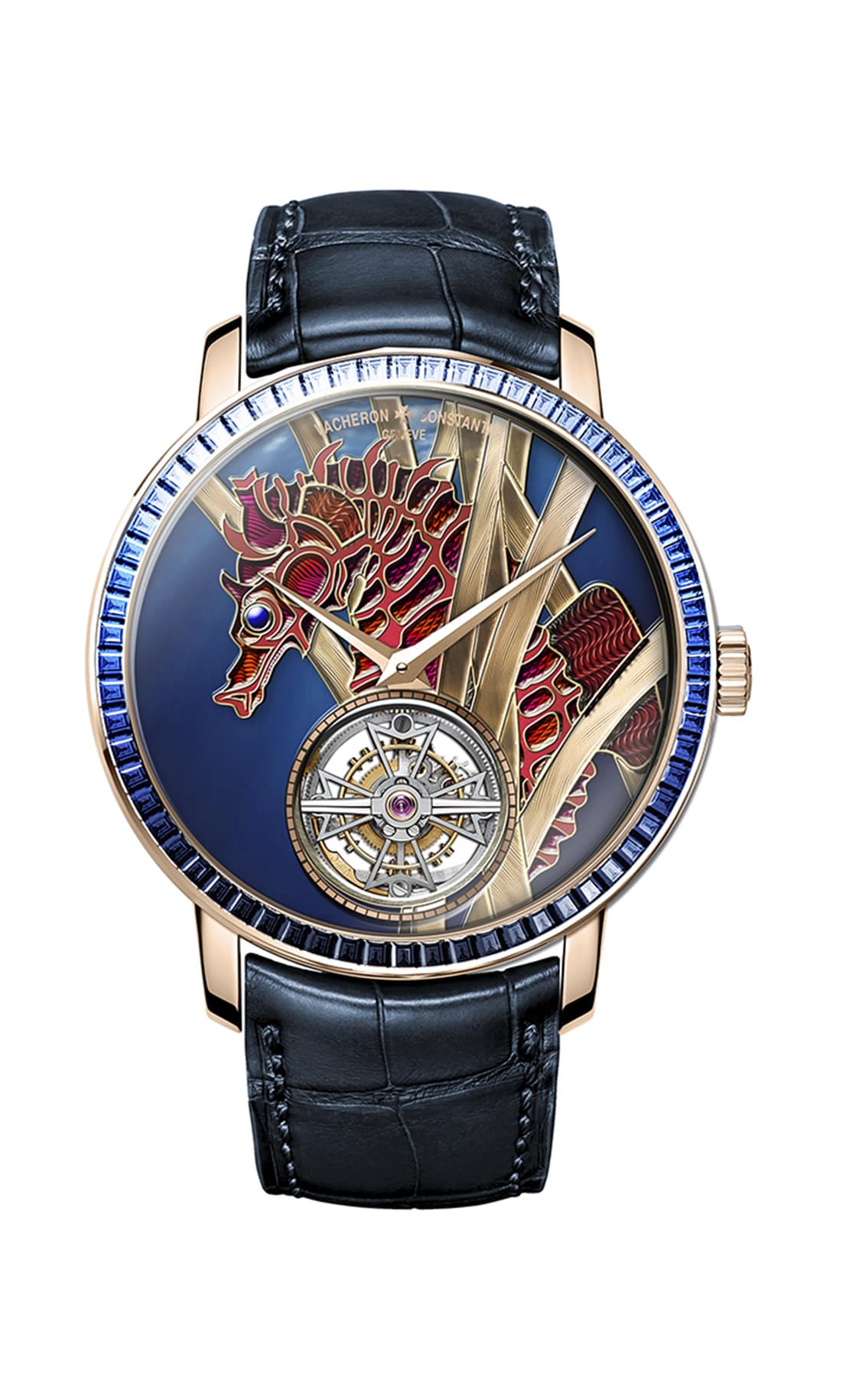 Questo capolavoro di miniaturizzazione sfrutta il savoir-faire di quattro métier d’art per conferire profondità alla scena riprodotta. Per cominciare, si delinea la decorazione sul quadrante per creare il motivo guilloché e si incidono le celle, quindi si esegue una meticolosa smaltatura cloisonné e, infine, si incastona l’occhio del cavalluccio marino. L’incastonatura continua sulla lunetta con zaffiri taglio baguette dalle delicate nuance blu. Alloggiato in una cassa in oro rosa del diametro di 39 mm, il calibro 2160, sviluppato e prodotto da Vacheron Constantin, asseconda le eleganti curve dell’orologio grazie allo spessore straordinariamente ridotto. Il Movimento tourbillon a carica automatica, dotato di rotore periferico che ne enfatizza ulteriormente il profilo sottile, dispone di 188 componenti, batte al ritmo di 18.000 alternanze all’ora, è spesso solo 5,65 mm e presenta finiture particolarmente meticolose.