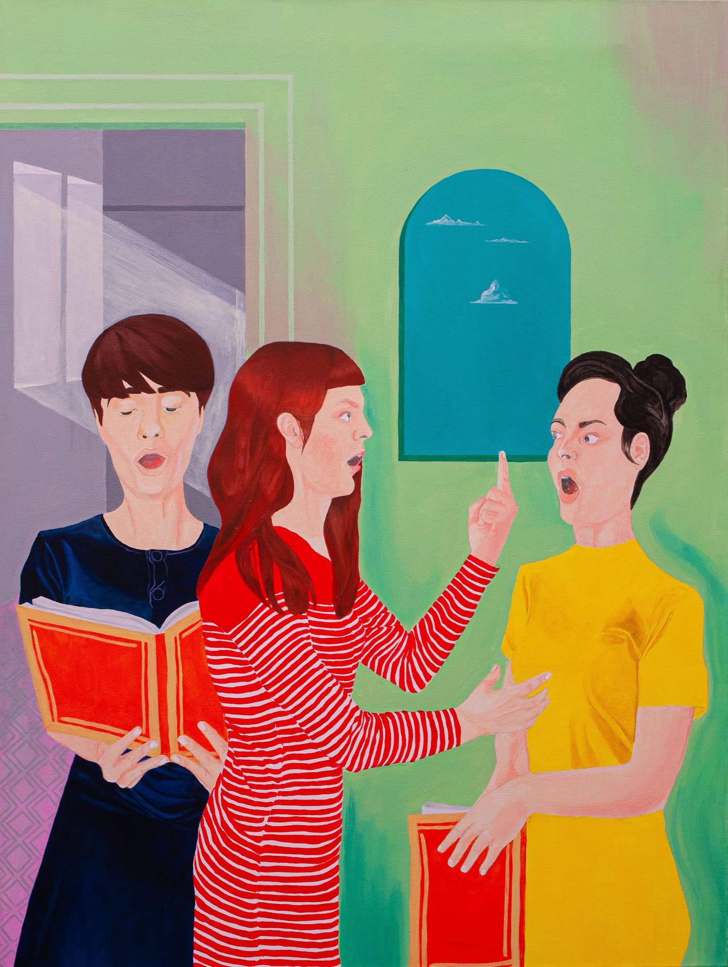 Irene Balia, artista sarda classe ‘85, con le sue atmosfere enfatizzate da colori pieni e pastosiè in grado di comunicare un senso di inquietudine non sempre immediato. I protagonisti dei suoi dipinti appaiono enigmatici, indecifrabili, ambigui, talvolta mascherati o con gli occhi chiusi. I dettagli e ciò che sta in secondo piano sono fondamentali per la lettura dei suoi lavori: finestre spalancate su panorami deserti, tempeste e naufragi dentro un bicchiere, cieli tempestosi, cuori sepolti sotto la sabbia. Le sue tele si pongono in bilico tra il ricordo e rimpianto.