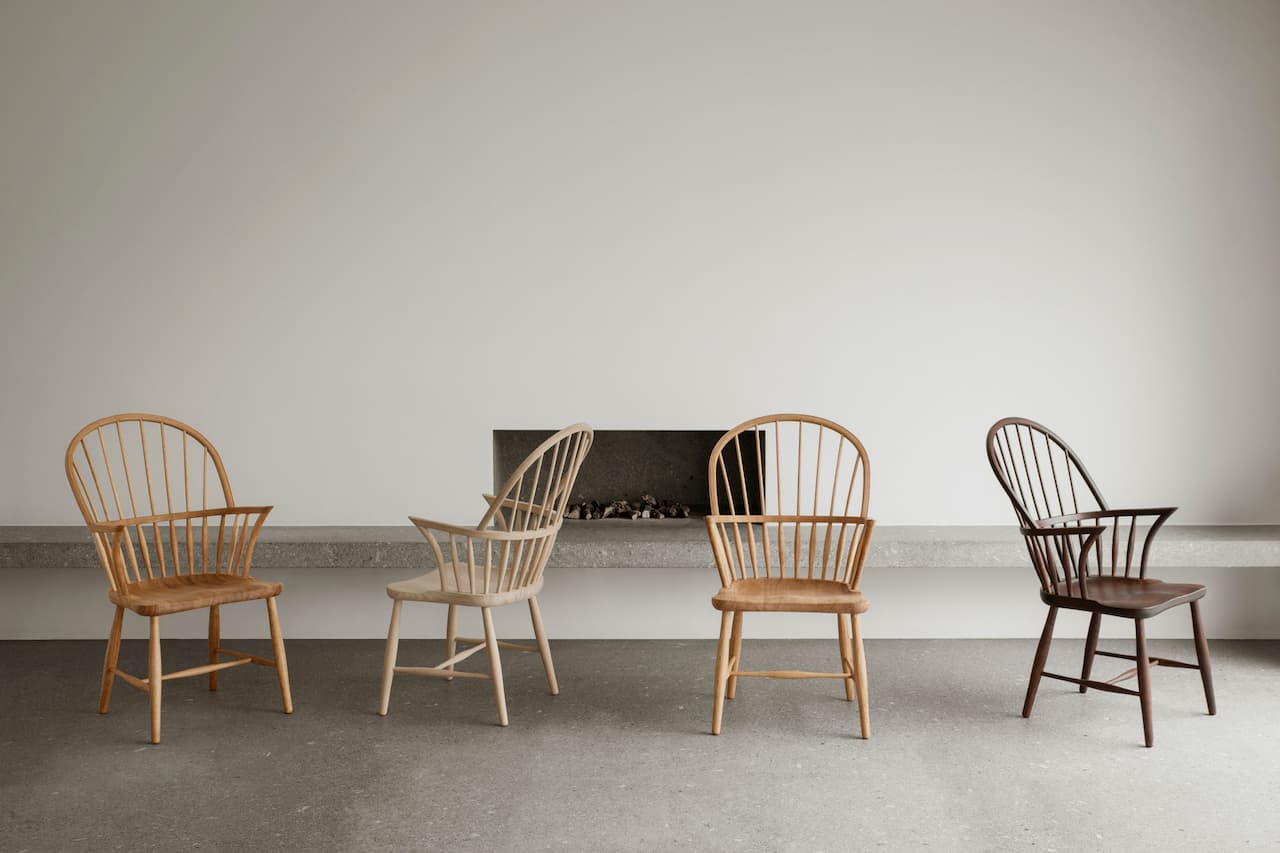 Henningsen si ispirò allo stile Impero della Francia dell’800, al rococò e all’arredamento inglese del XVII secolo, reinterpretando queste tendenze di gusto con un tocco scandinavo moderno privo di dettagli decorativi superflui e incentrato sulla funzionalità, un artigianato di qualità e un’estetica definita. La Windsor Chair di Henningsen è una sedia da pranzo in rovere massello dotata di uno schienale alto che presenta diverse difficoltà produttive, così come varie tecniche di lavorazione. La realizzazione della sedia richiede quindi l’abilità di un falegname esperto, il che ci ricorda che lo stesso Henningsen fu un designer ed ebanista interessato allo studio del potenziale dei materiali.
