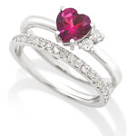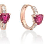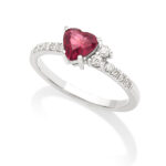 Il cuore, protagonista di tutti i gioielli, è creato con la rodolite naturale, una pietra della famiglia dei granati che si distingue per il suo colore rosa intenso tendente al rosso. La pietra centrale è affiancata dai diamanti bianchi in un gioco di asimmetrie che definiscono la cifra della collezione in un continuo rimando tra forme e colori.