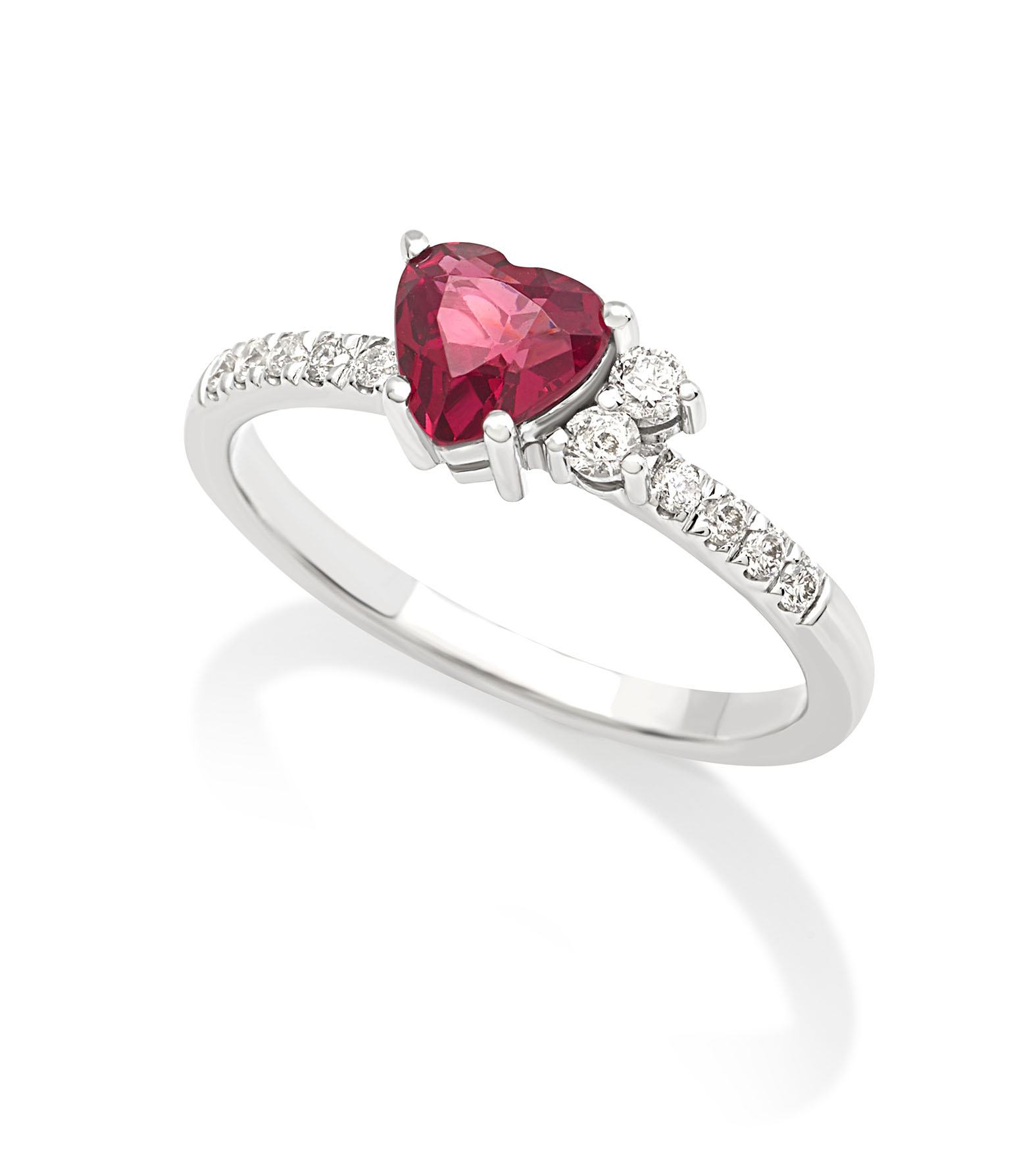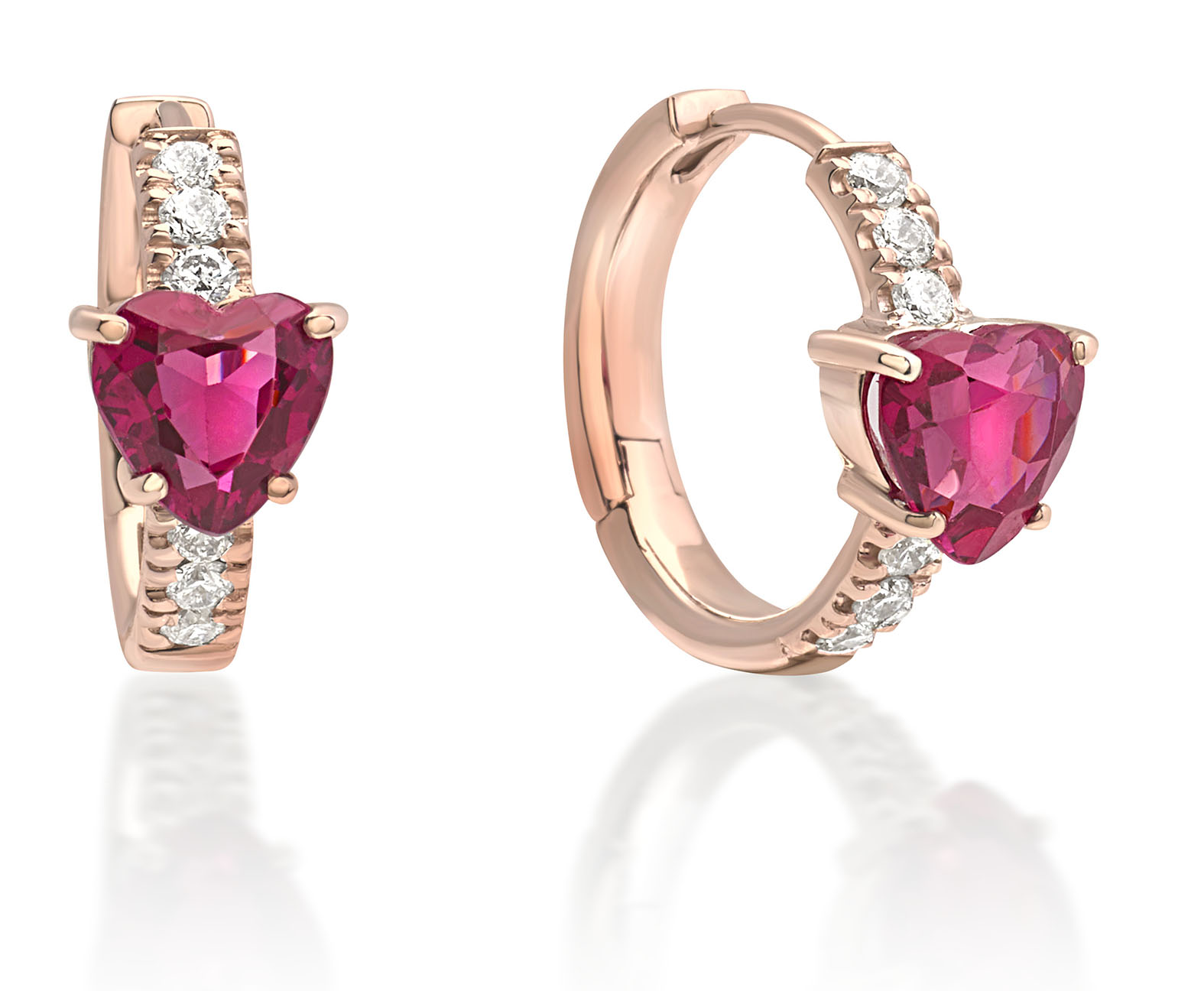Il cuore, protagonista di tutti i gioielli, è creato con la rodolite naturale, una pietra della famiglia dei granati che si distingue per il suo colore rosa intenso tendente al rosso. La pietra centrale è affiancata dai diamanti bianchi in un gioco di asimmetrie che definiscono la cifra della collezione in un continuo rimando tra forme e colori.