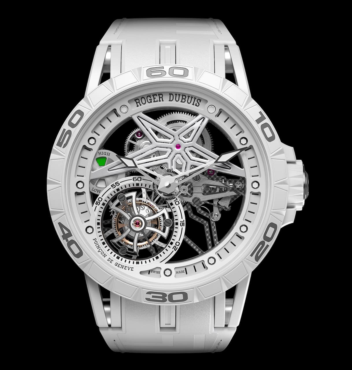 L’Excalibur Spider Pirelli MT celebra uno straordinario anniversario stabilendo, al contempo, un legame fra i due partner attraverso il loro comune interesse per i materiali innovativi. Infatti questa passione condivisa è visibile nella cassa e nella lunetta da 45 mm dell’Excalibur Spider Pirelli MT realizzate in MCF – Mineral Composite Fiber – di un bianco purissimo. Questo materiale iper-tecnologico, proprietà esclusiva di Roger Dubuis, è un’autentica dimostrazione di maestria tecnica. Grazie a un procedimento noto come Sheet Molding Compound (SMC), il silicio è lavorato in modo da produrre l’MCF. La sua leggerezza (13% più leggero del carbonio SMC) lo rende estremamente comodo da indossare al polso, mentre la sua struttura robusta permette la creazione di design intricati.