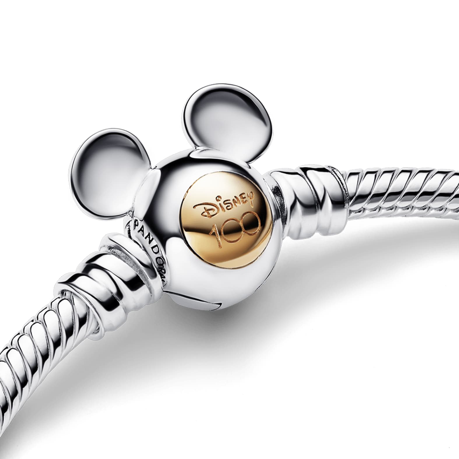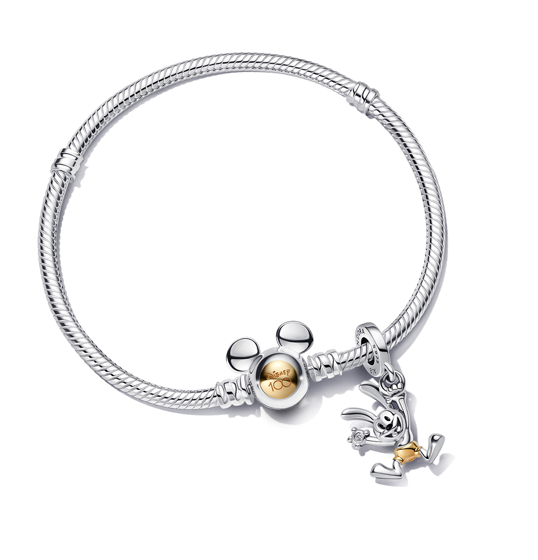 Dispettoso e amante del divertimento, Oswald il Coniglio Fortunato è sempre pronto a reagire con prontezza, soprattutto perché anche le sue zampe di coniglio sono fortunate. Il design unico di Pandora raffigura il vivace Oswald che salta per afferrare uno scintillante diamante creato in laboratorio. Il bracciale dedicato Disney100 è il modo perfetto per iniziare la collezione, realizzato in argento sterling 925 con inserti in oro 14 carati e una chiusura ispirata all’iconica silhouette della testa di Topolino.