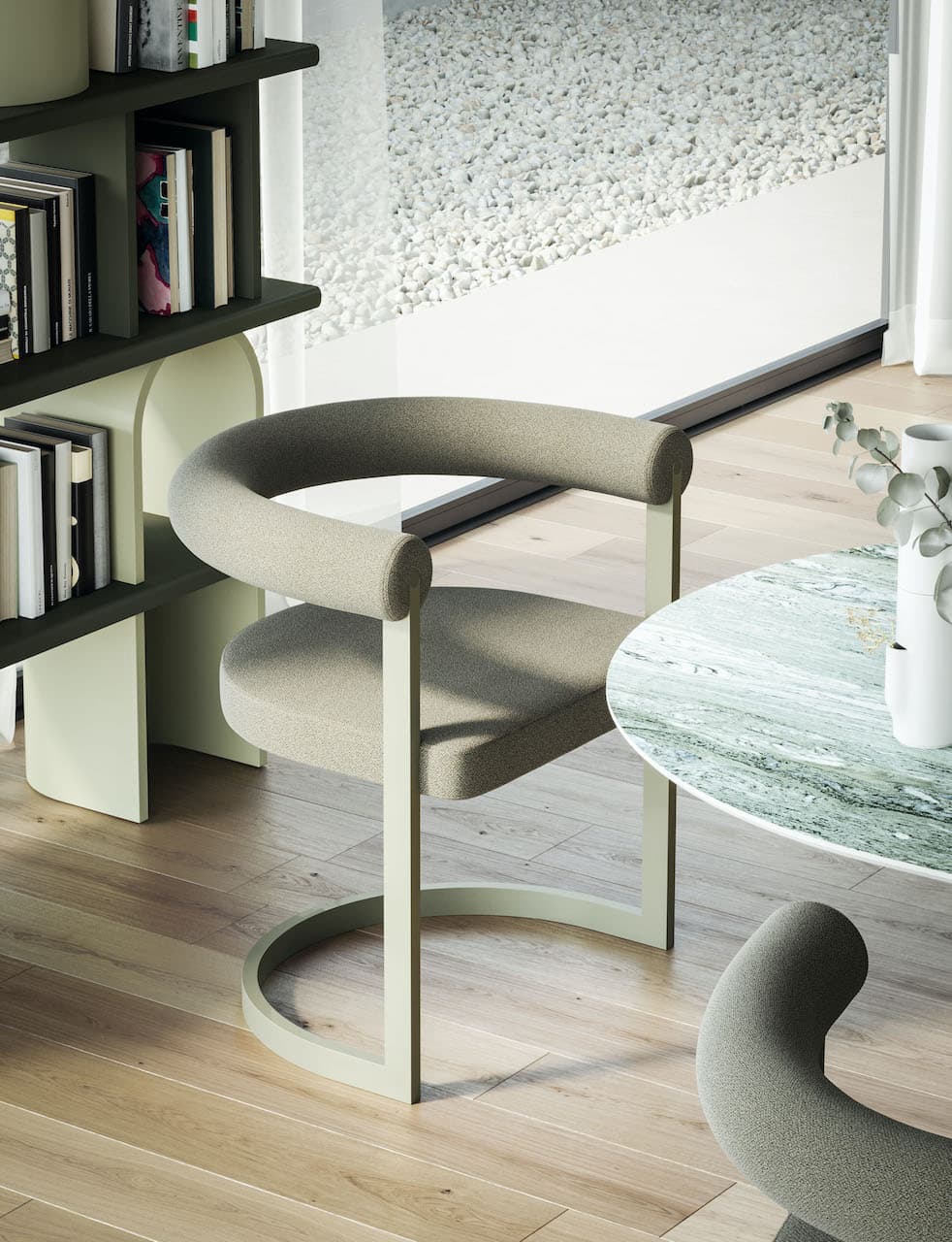 Stile aerodinamico per Dharma, sedia che nella struttura in metallo reinterpreta la classica forma cantilever abbinata a seduta e schienale imbottiti. Un design originale e leggero, quasi sospeso, dove base, seduta e schienale delineano un gioco di semicerchi: metallo e imbottiti, tra loro intersecati, realizzano una seduta dall’estetica armonica ed eterea.