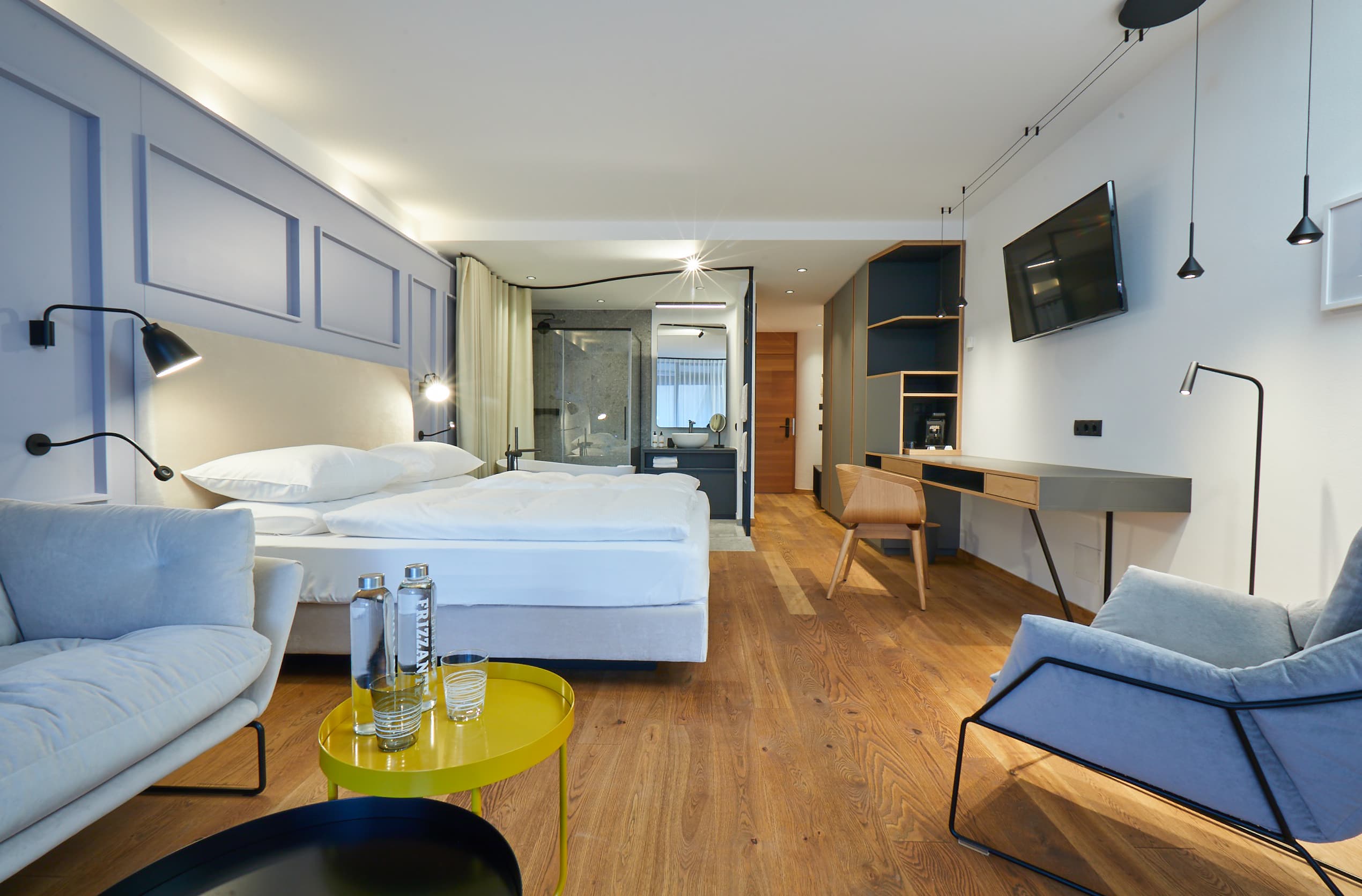 Infine, con l’intervento sulla facciata sud dell’hotel è stata rimessa a nuovo la struttura esterna composta da ampie capriate in legno che si fondono con il paesaggio alpino della Val Venosta. La luce naturale entra nelle camere grazie alle nuove finestre panoramiche: la privacy è garantita da persiane scorrevoli in legno, posizionabili individualmente a proprio piacimento per ridurre l’esposizione al sole.