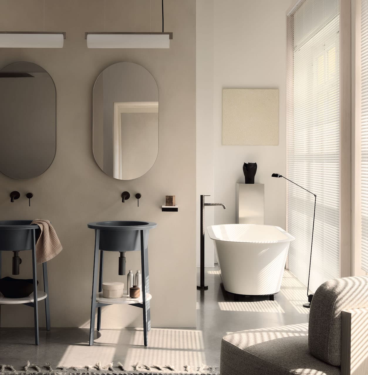 Con le ultime novità de I Catini continua il dialogo tra innovazione e tradizione, che da sempre contraddistingue il lavoro dei due designers. Ecco quindi le due nuove vasche freestanding della Collezione, Ottavia e Ofelia: appoggiate su una struttura con piedini in metallo, reinterpretano la baignoire. Dalle linee classiche ed essenziali la prima, la seconda è invece arricchita da un comodo schienale e un bordo che funge da pratico piano d’appoggio. Entrambe sono realizzate in LivingTec, un innovativo materiale studiato per soddisfare i più alti standard in termini di qualità e tecnologia, e possono essere declinate nelle finiture Bianco Matt, Brina e Arenaria.