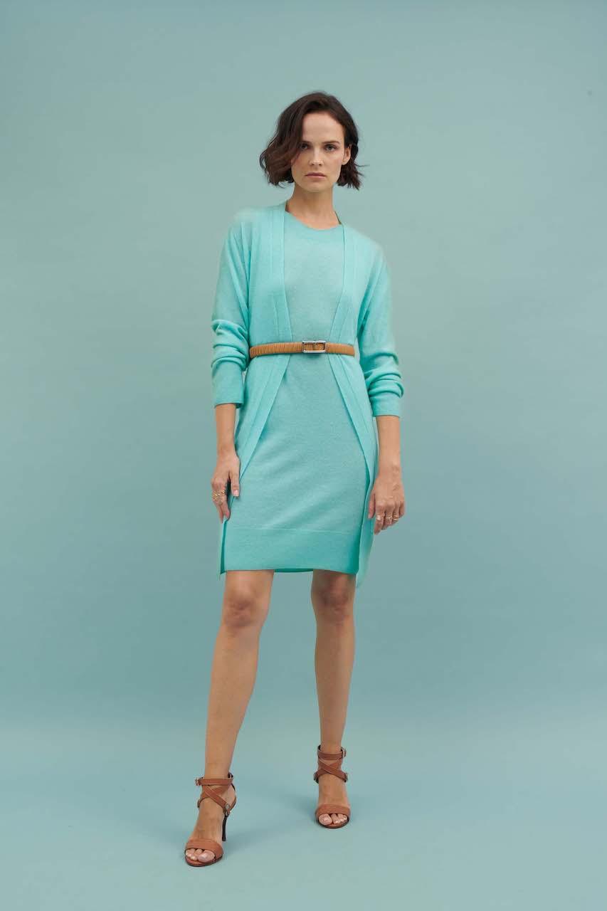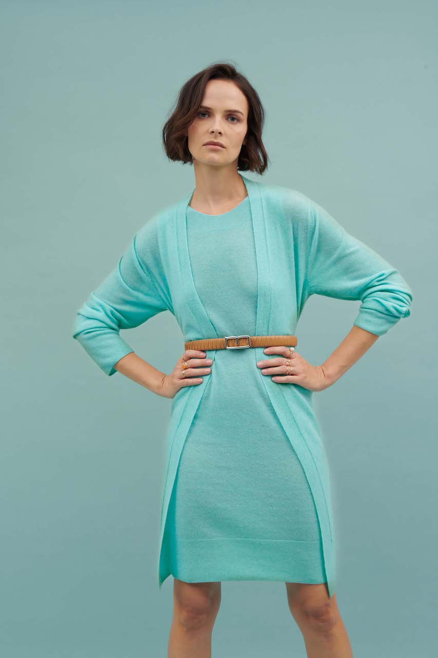 La proposta “Watery Woman” si compone di cardigan e maglie realizzate in super soft cashmere, un filato di cashmere contenente una minima percentuale di fibra poliammidica che serve a dare stabilità evitando torsioni. Essendo un filo a capo unico, la maglia pesa la metà rispetto a una maglia “comune” realizzata sulla stessa finezza, perché la fibra, estremamente leggera e dalla naturale elasticità, rende il capo, morbido, leggero, quasi impalpabile. Inoltre, queste maglie sono realizzate con la tintura in capo, un processo che consiste nel tingere il capo già confezionato, conferendo così un aspetto materico e una mano morbida. I capi sono arricchiti dalla tessitura effetto garza per un risultato di grande leggerezza, dalle finiture con lavorazione maglia rovesciata o links, caratterizzata da combinazioni di diritto e rovescio.