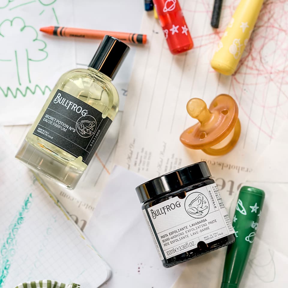 Terzo Bullfrog-Papà è il “papà sportivo” Alessandro, il digital manager che ama il calcio e il padel, le sfide e la competizione. Nel suo borsone naturalmente sono presenti il gel doccia multiuso della sua fragranza preferita Secret Potion n.3 per corpo e capelli e ancora Agnostico, il best seller per idratare il viso e la barba, anche corta.