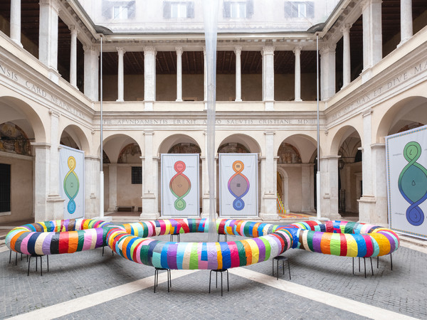 Nel percorso, le quattro grandi installazioni site specific prodotte da DART – Chiostro del Bramante, completano il percorso riproponendo e attualizzando lavori particolarmente significativi, come Grande sfera di giornali (1966 – 2023), costruita all’interno della sala fino a occupare le dimensioni massime consentite dallo spazio; Labirinto (1969 – 2023) che costituisce una via sinuosa e indirizza verso le altre sale espositive alterando la percezione dell’architettura, l’annuncio programmatico Love Difference–neon (2005 – 2023), installazione luminosa composta da venti scritte al neon e presentata per la prima volta in occasione della Biennale di Venezia, dove l’artista ha ricevuto il Leone d’oro alla carriera, oltre a una versione del Terzo Paradiso, realizzata in polistirene e PVC colorato a vent’anni di distanza dalla prima ideazione nel 2003, che occupa gli spazi esterni.