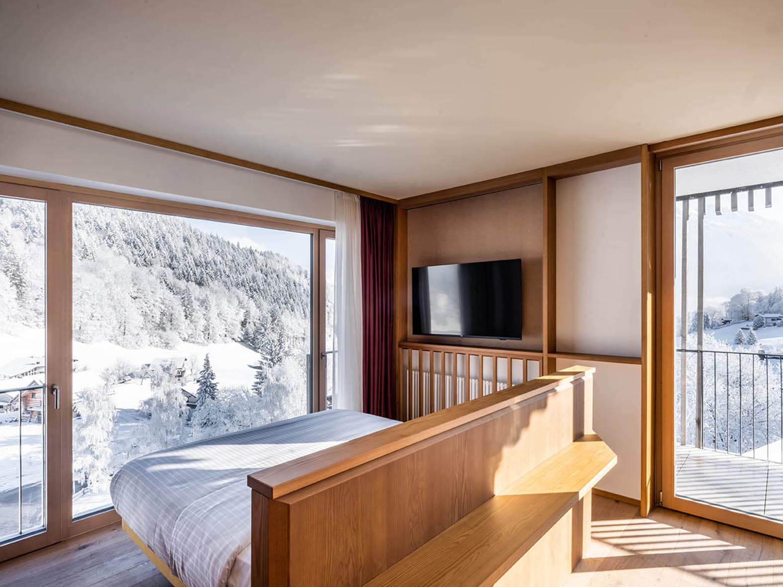 Tra la natura incontaminata del Montafon, dove le catene montuose più grandi si incontrano formando il “Cuore delle Alpi”, boschi, pascoli, malghe e fienili raccontano di secoli di storia fatta di spostamenti stagionali dei pastori e del loro bestiame. Gli architetti, rispettosi dell’anima e del genius loci, hanno utilizzato riferimenti del territorio: le recinzioni di rami intrecciati e le listarelle di legno tipiche dei fienili della zona sono ripresi come elementi decorativi e divisori nell’area ristorante, mentre i tappeti artigianali locali sono riprodotti su wallpaper custom made utilizzati come testate per i letti in tutte le camere. Materiali vernacolari, come la pietra, il legno di abete e di larice e l’intonaco