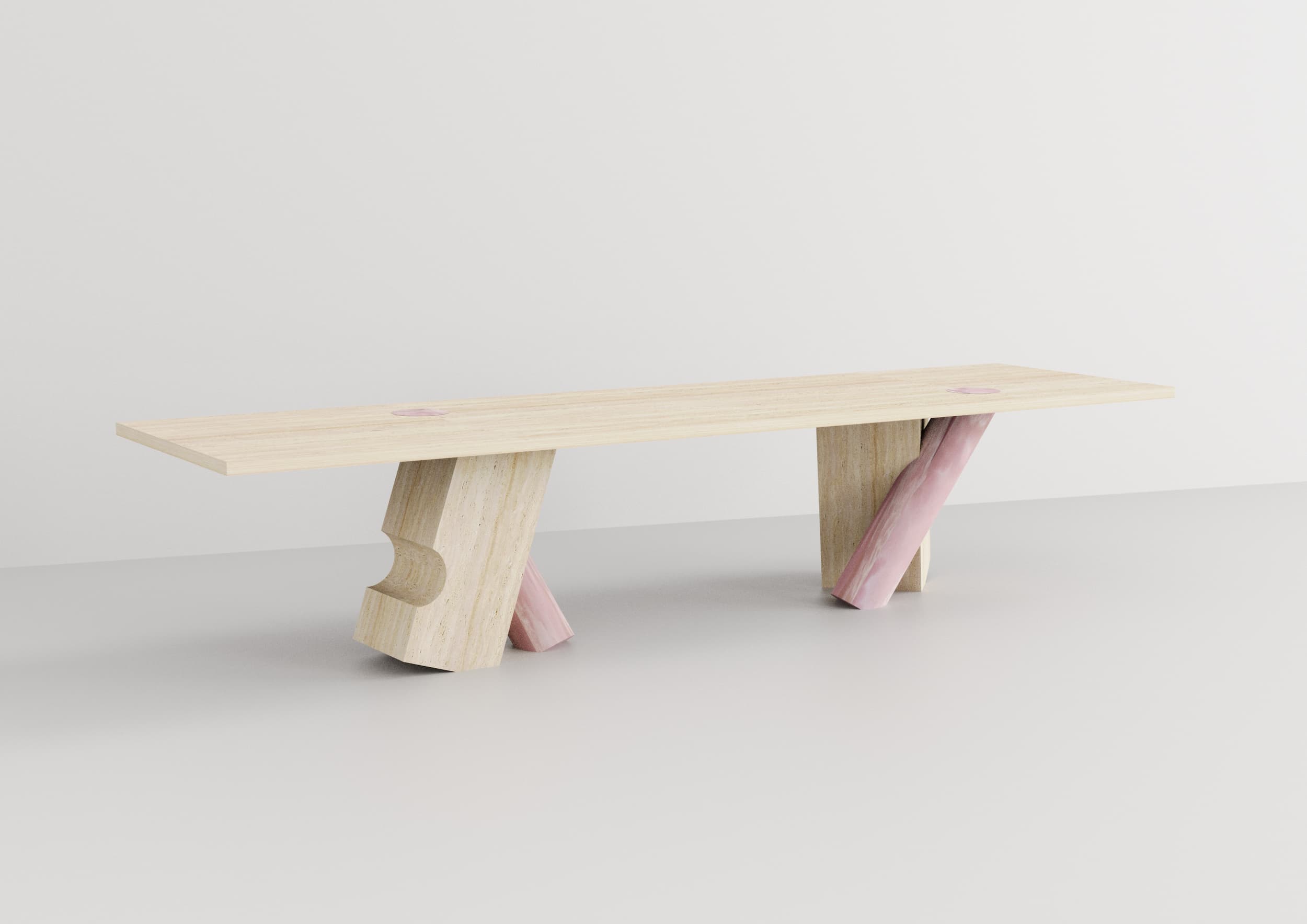 Il grande Living Table Aquarel, realizzato in Travertino Classico Romano a poro aperto e sabbiato, si presenta con un ampio piano monolitico rettangolare e una base composta da quattro elementi geometrici in Travertino perforati da delicati cilindri in Onice Rosa.
