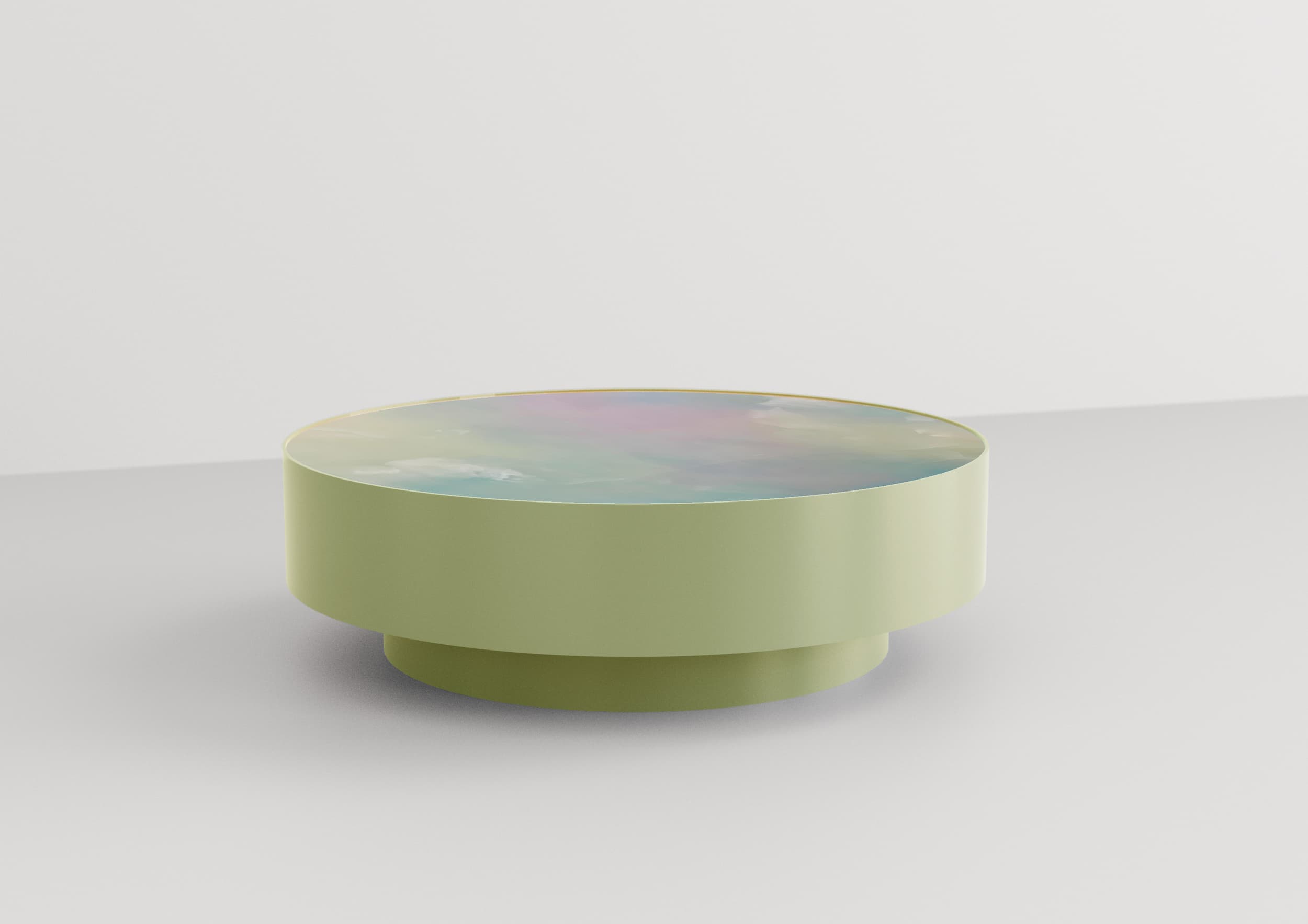 Aquarel Low table: il top circolare realizzato in Onice Bianco iraniano Aquarel sfumato nei toni del verde e del rosa e pesca, appoggia sulla base a vassoio color verde chiaro.