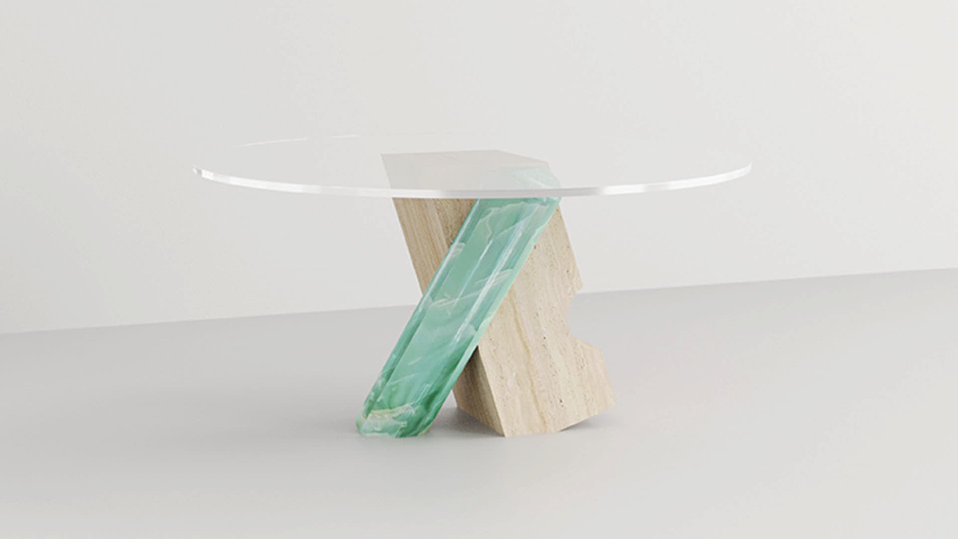 Il tavolo circolare Pierce invece si caratterizza per il piano circolare in vetro extrachiaro che appoggia su una base monolitica di Travertino perforato anch’esso da un cilindro in Onice Verde menta.