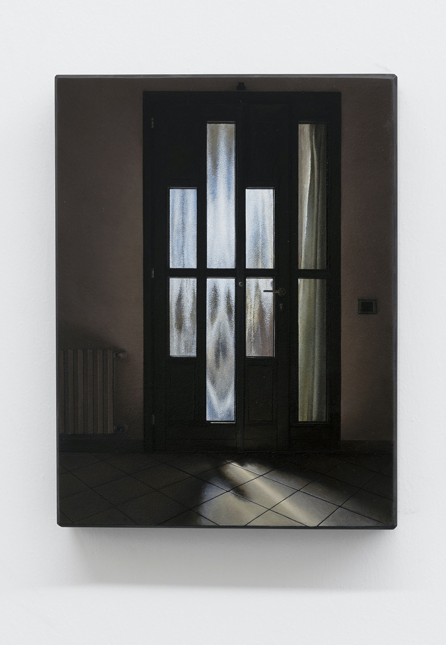 Nei due dipinti presentati, gli ambienti sono descritti nei minimi dettagli e indagati attraverso le soglie – porte, finestre, serrande -, come varchi per un simbolico passaggio verso l’esterno, quasi dei filtri che dividono un ambiente votato alla protezione da un “fuori” inteso come spazio dell’alterità e della scoperta.