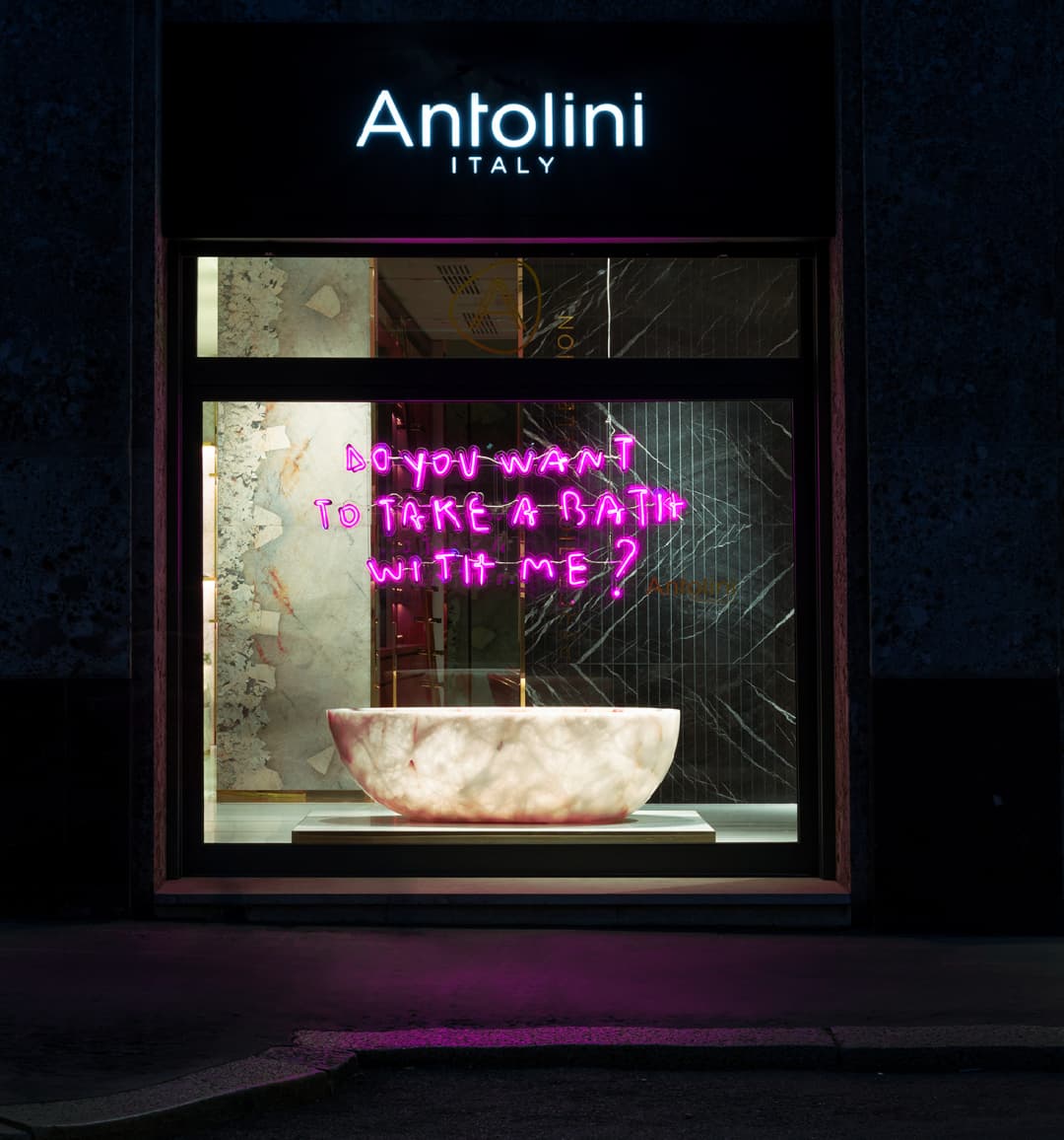 In occasione della Milano Design Week 2023, Antolini MilanoDuomo Stoneroom diventa palcoscenico di un inaspettato dialogo tra il dinamismo anticonformista della street art e l’eterna e innata bellezza delle pietre naturali. Grazie all’avanguardia tecnologica di Antolini, presente, passato e futuro si intrecciano nell’installazione I WANT IT WOW dove i claim di Pietro Terzini in forma di LED, intarsi e opere d’arte, meraviglieranno i visitatori sollecitandone sensi e immaginazione. Un progetto cross disciplinare dove la Pietra Naturale è protagonista assoluta, diventando superficie sulla quale prendono vita le frasi che il giovane artista ha concepito ispirato dalla sua visione della vita e dalla conoscenza dell’expertise di Antolini.