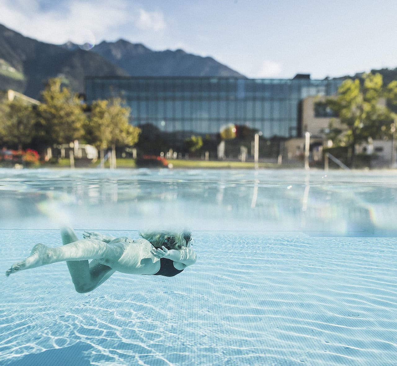 Con una superficie d’acqua di quasi 1.200 mq e una profondità compresa tra 1,40 e 2 metri, il Bio Nature Pool offre molto spazio per nuotare. Le piattaforme in legno a bordo vasca danno quasi la sensazione di essere seduti in riva al laghetto di ninfee con il quale confina. Il nuovo Bio Nature Pool non sostituisce infatti il laghetto delle ninfee, posto al centro del Parco termale e punto di attrazione per grandi e piccoli, che mantiene un sistema idrico separato e indipendente e rimane non balneabile. Numerose altre piscine, di diverse tipologie e dimensioni, trovano posto nel grande prato curato, in una superficie di oltre 5 ettari. Un’oasi verde di alberi secolari e angoli fioriti proprio nel centro della cittadina meranese. Qui, a disposizione degli ospiti, anche 8 Relax Lounge,angoli di benessere con lettino relax di coppia dove trovare refrigerio dalla calura estiva. Il tutto contornato dalla splendida vista sulle cime del gruppo del Tessa.