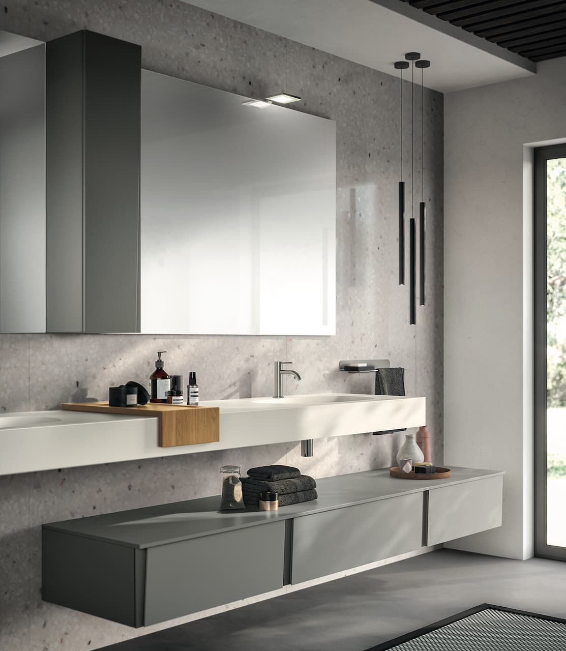 Un elogio della verticalità. Reinventata da una lieve inclinazione, regala un inedito twist dinamico. La collezione Lagu di Scavolini, design Castiglia Associati, è caratterizzata da una linea ricercata che coniuga l’eleganza delle forme alla funzionalità dell’ergonomia. Il progetto Lagu propone una soluzione di design inedita, ideale per arredare la stanza da bagno con stile, raffinatezza e un tocco di originalità. La lavorazione nello spessore dell’anta, che funge da presa per l’apertura, è proprio la cifra stilistica di questa collezione.