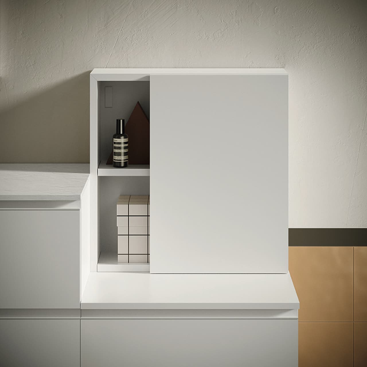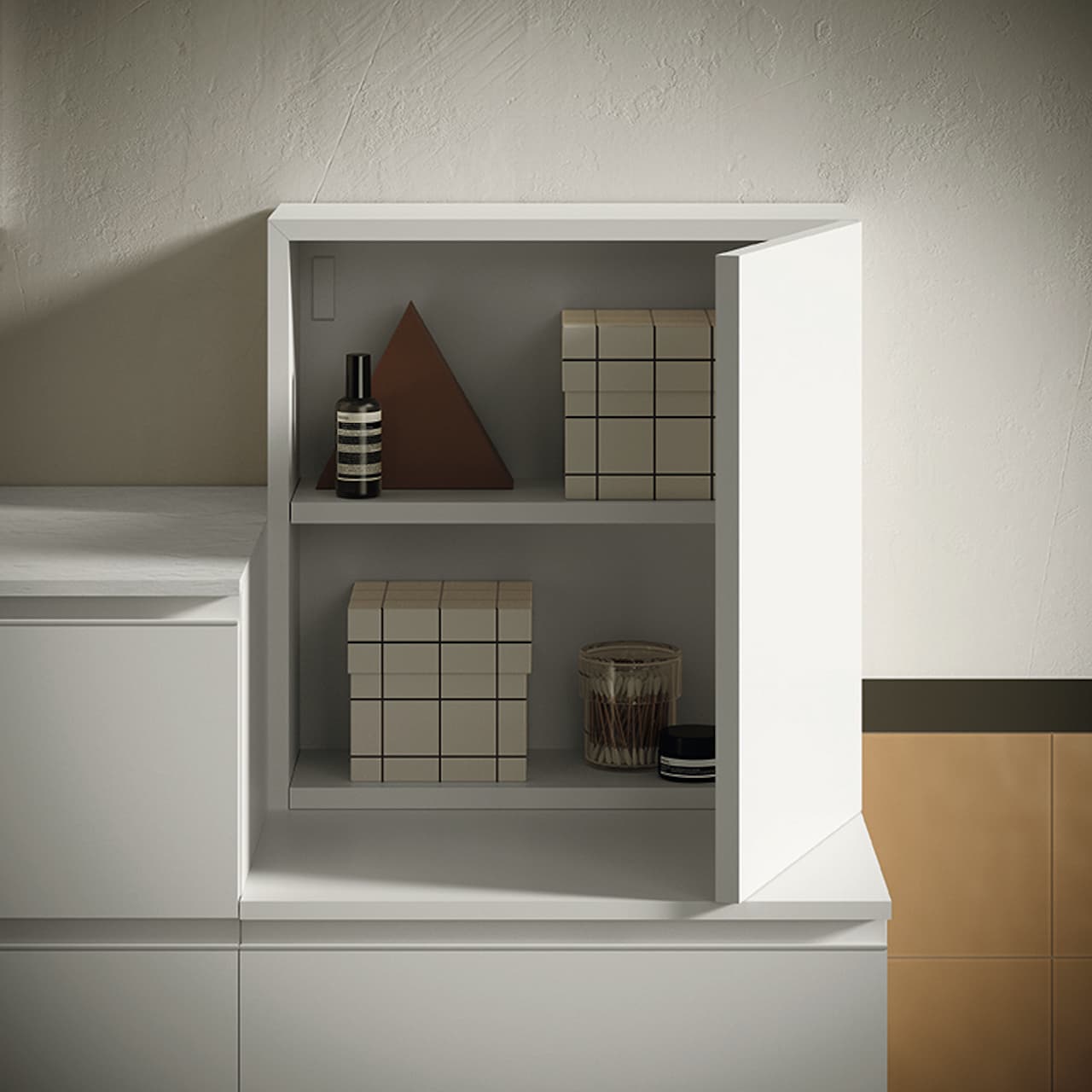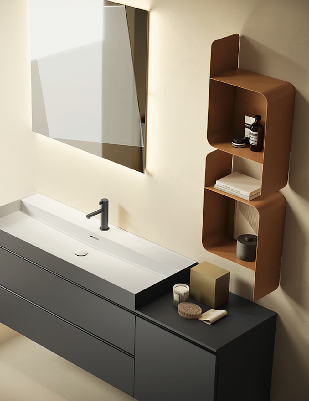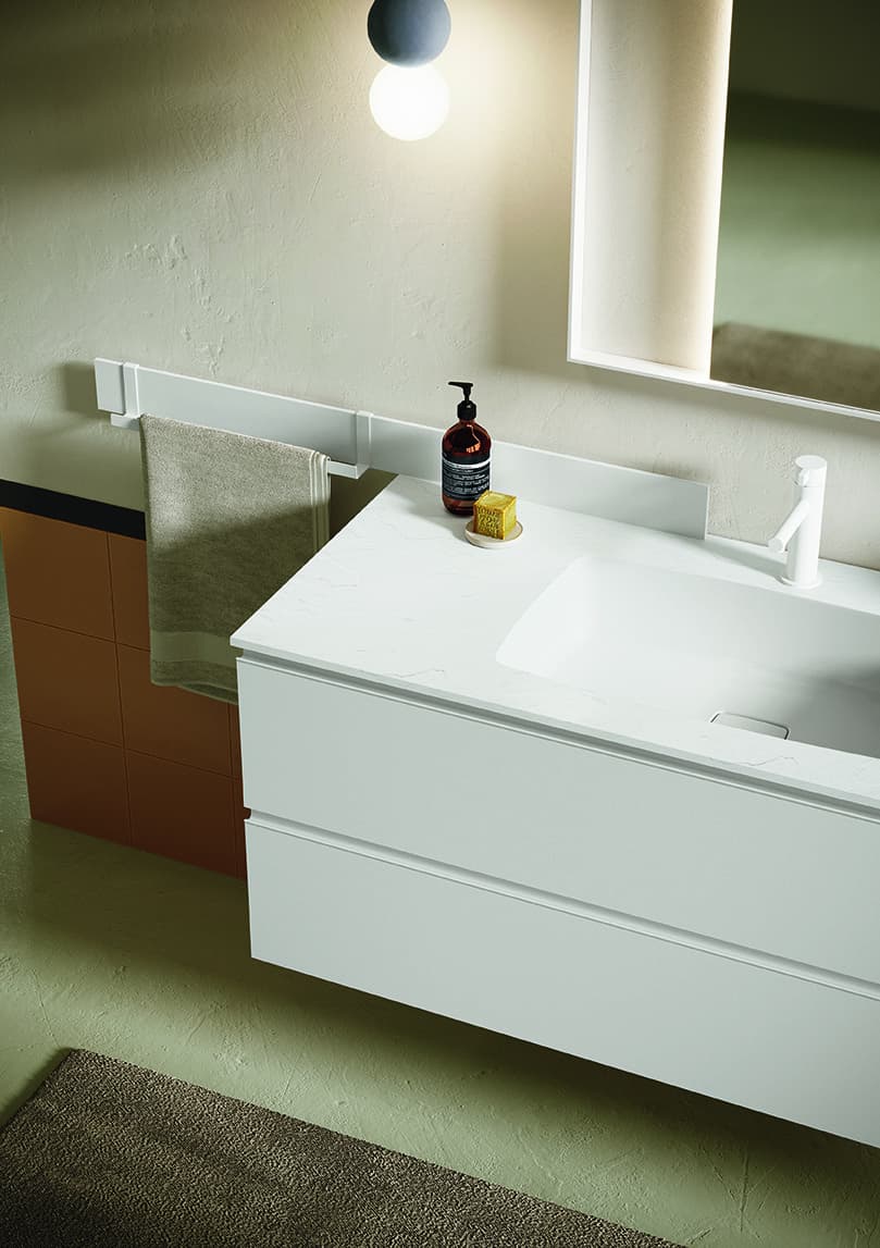 Una collezione nata per disegnare il proprio bagno conferendogli dinamicità e pulizia stilistica, grazie alla sua caratteristica principale: la maniglia a gola laccata che veste le superfici, un dettaglio in alluminio che arricchisce tutta la lunghezza del mobile. In sinergia con i nuovi moduli a giorno terminali, con doppio accesso laterale e frontale, la maniglia a gola è un sistema di apertura che asseconda il design e lo stile più giovane e contemporaneo, senza rinunciare alle esigenze pratiche di funzionalità. Conferisce a pensili ed ante una sensazione di coerenza e rigore formale, amplificando l’equilibrio compositivo, in un’alternanza di pieni e vuoti che plasmano l’ambiente bagno.