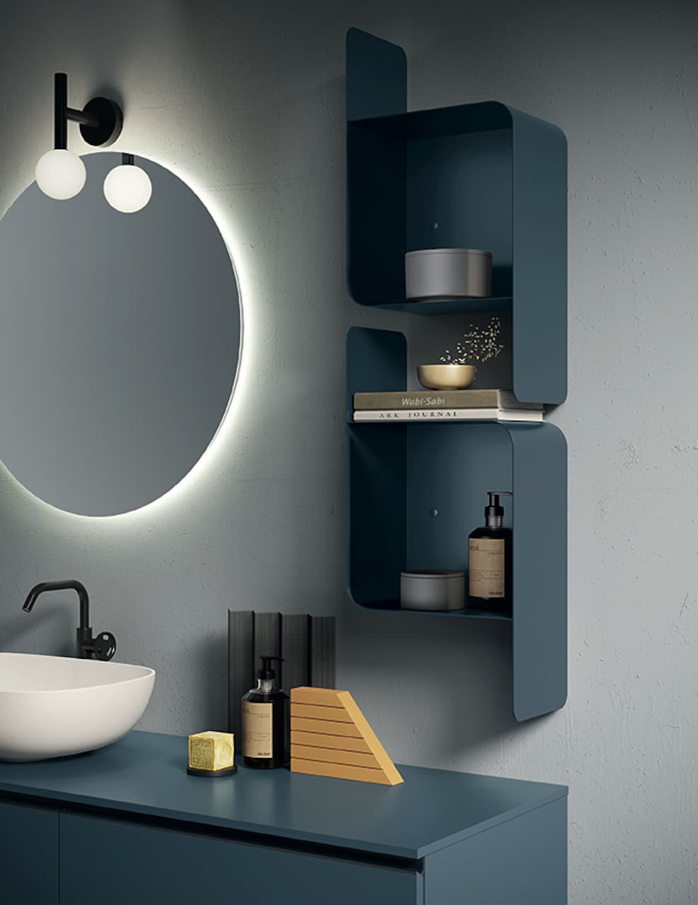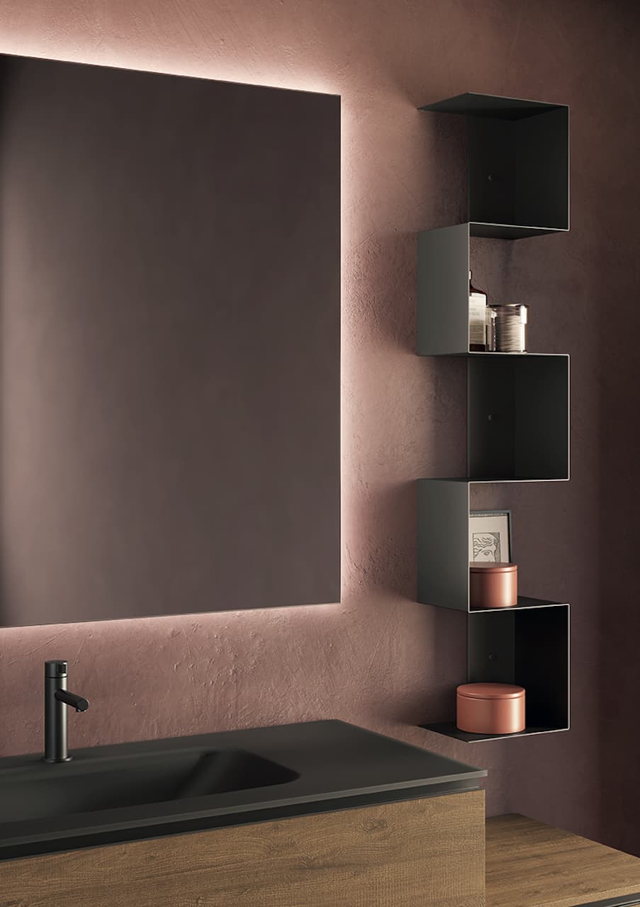 Tra gli elementi di design a cui può essere abbinata, diverse novità: la specchiera Illusion, le mensole Bird, la barra accessori Mikado e i nuovi pensili Ardeco.
