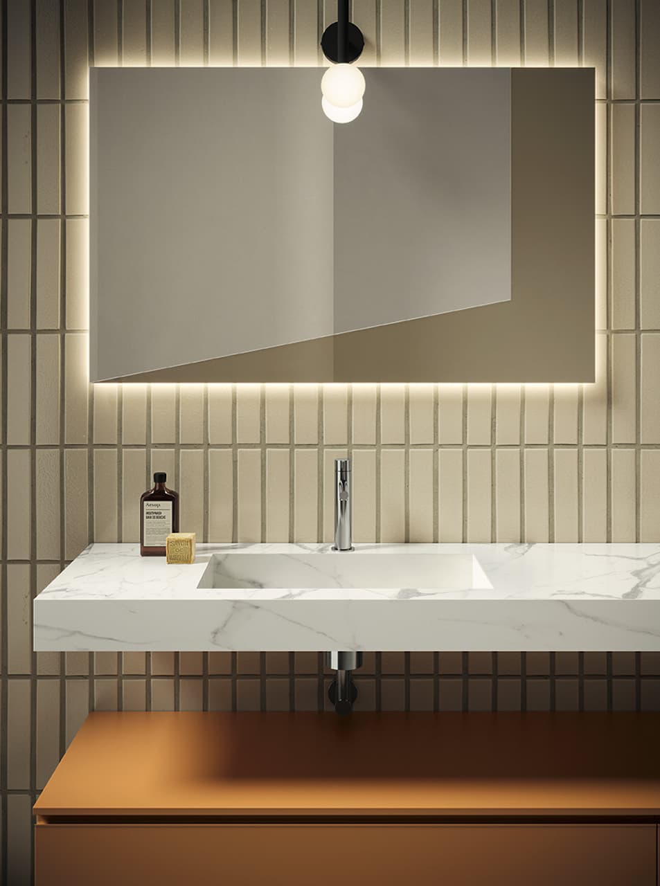 Tra gli elementi di design a cui può essere abbinata, diverse novità: la specchiera Illusion, le mensole Bird, la barra accessori Mikado e i nuovi pensili Ardeco.