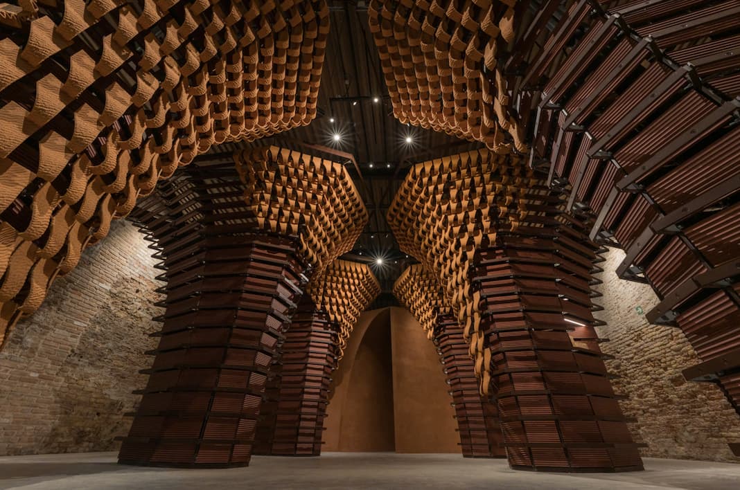 Il viaggio all’interno dei tre volumi principali del Padiglione inizia attraversando sei archi, veri e propri portali di accesso. Imponenti strutture di metallo a otto facce rivestite internamente con pannelli di legno ed esternamente con mattonelle dell’eredità di ceramica stampate in 3D – con un andamento irregolare e ondulatorio che ricorda le dune del deserto – i portali trasmettono un’idea sia di imponenza che leggerezza, evocando da un lato le architetture monumentali scolpite nella pietra e nelle grotte, possenti, apparentemente indistruttibili e durature nel tempo, e dall’altro la transitorietà della condizione materiale, instabile come la sabbia del deserto di Rub’ al-Khali, detto il “quarto vuoto”, con il rivestimento esterno che progressivamente scema fino a scomparire.
