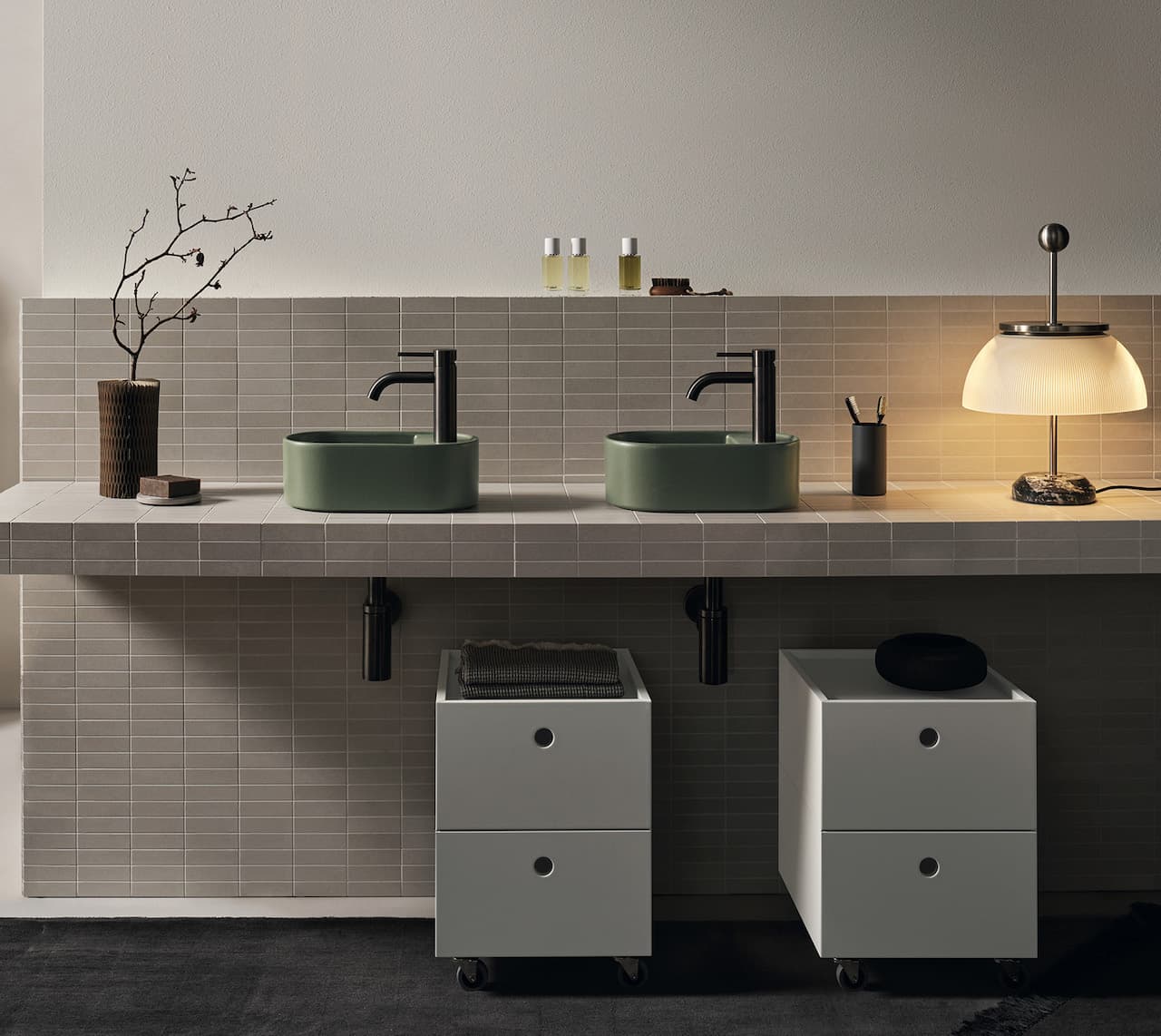 Les Petites è anche disponibile nelle varianti lavabo sospeso o da appoggio alle quali abbinare la nuova cassettiera Luisa, caratterizzata da due cassetti modulari disponibili in 2 altezze differenti (h20 e h34). La modularità e la composizione rendono Luisa un oggetto pratico e flessibile, dal valore estetico semplice e rigoroso. I moduli, impilabili in altezza, possono essere laccati nelle Terre e nelle Acque di Cielo, mixati tra loro per un effetto altamente personalizzato. Il top del cassetto può inoltre essere retroverniciato o in pietra Azul Noche e i contenitori hanno anche la possibilità di essere posizionati su ruote.