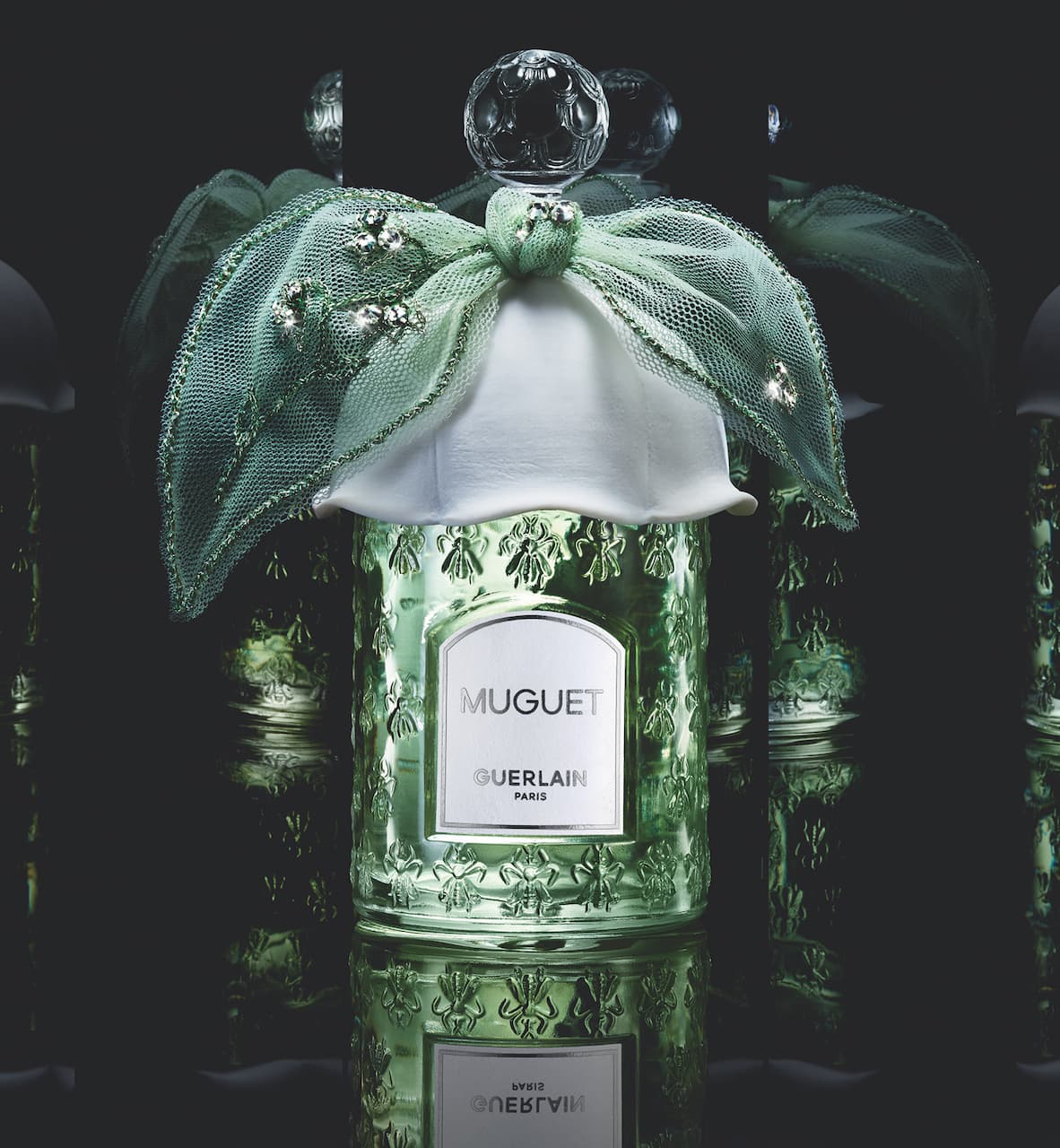 Per riprodurre la morbidezza delle foglie, Guerlain si è rivolta ad Ateliers Vermont, una Maison di ricamo di Alta Moda, che ha creato un meraviglioso fiocco di tulle, incredibilmente parigino, ricamato con rametti di mughetto e legato al collo del leggendario Flacone.