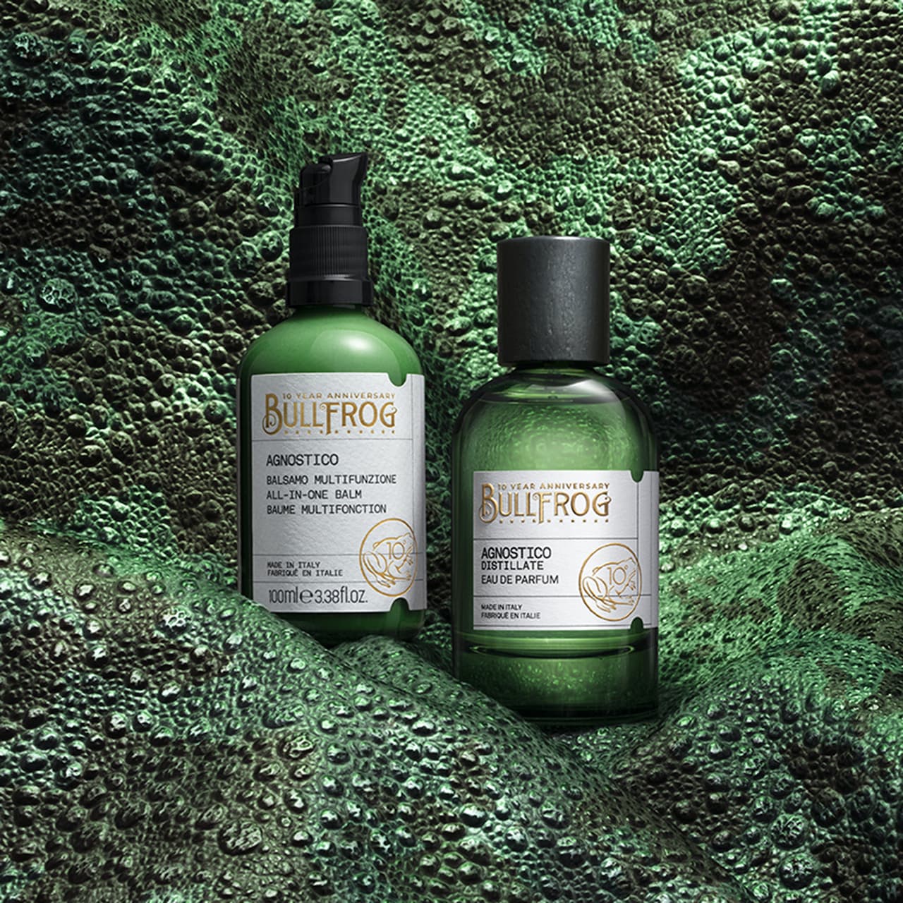 Tutto questo ha meritato una grande festa. Il 12 giugno scorso Bullfrog ha invitato una selezione di clienti e barbieri nel flagship barbershop di piazza Alvaro Aalto a Milano per un brindisi speciale e per scoprire il mondo Bullfrog.Per questa speciale occasione sono stati realizzati ad hoc oggetti cult celebrativi, come t-shirt e shopper di tela con l’iconico logo, la ciotola da barba, spille e stickers, una speciale Bullfrog Gazette, un magazine ricco di contenuti speciali e interviste, e uno speciale volume illustrato sulla storia del brand e della barberia.Non solo, per festeggiare questa importante tappa, è stata realizzata una Limited Edition del prodotto icona: Agnostico, il balsamo multifunzione per barba, viso e capelli che per l’occasione si è vestito di color smeraldo, e la sua Eau de Parfum Agnostico Distillate, una reinterpretazione estremamente fedele della piramide olfattiva del balsamo, tanto amato dai suoi affezionati.