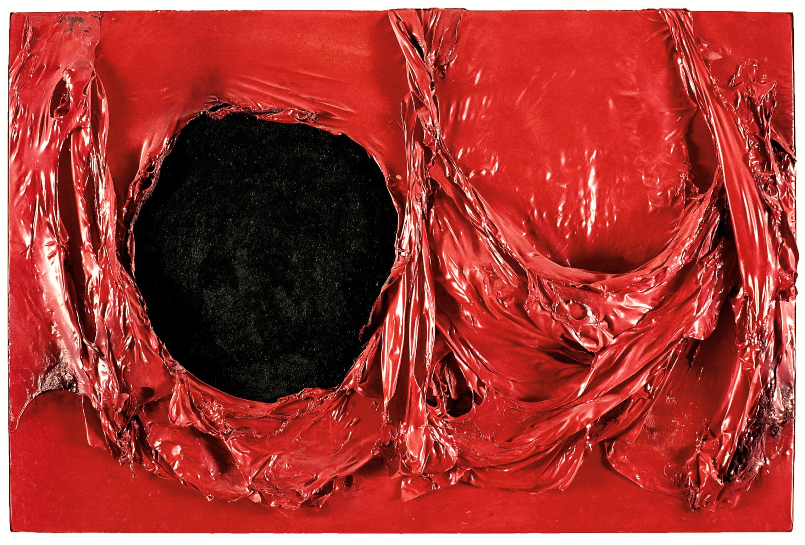 Qui la materia emerge prepotente dalla tela e l’attenzione è posta tutta sull’equilibrio tra forma e colore, con una predilezione per il nero e lo scuro, tratto diventato emblematico dell’artista tanto da essere soprannominato “il maestro dei neri”. Le opere di Burri così possono essere considerate una ideale dialettica proposizione con le tavole del Perugino: se nel Quattrocento il fondo nero serviva a far risaltare il soggetto principale dell’opera, in Burri il nero è protagonista e diventa materia viva che si espande ed emerge.