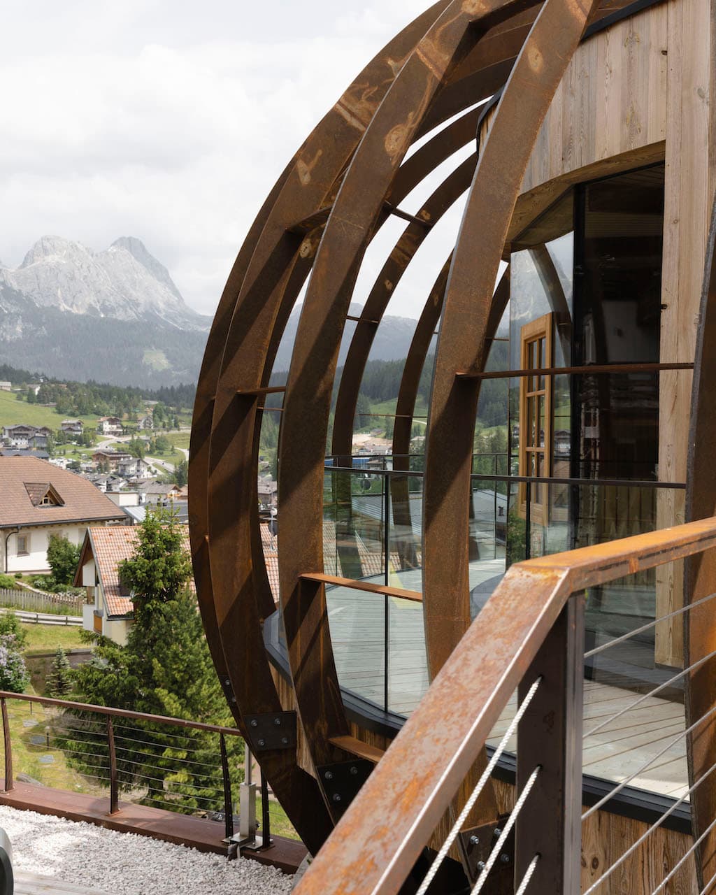 Elements offre una visuale panoramica e completa sul paesaggio Dolomitico circostante grazie alla grande vetrata; inoltre, ruota su se stessa a 360° ed è sospesa a 9 mt di altezza dal suolo. «Un progetto senza eguali sia strutturalmente che concettualmente: Elements, con la sua forma cilindrica, rotante e sospesa a 9 mt di altezza, simboleggia il campo energetico autosufficiente di tutte le forme viventi; inoltre, invita all’introspezione permettendoci di attingere al nostro immenso potenziale in mezzo al movimento incessante del mondo» spiega la Widmann.