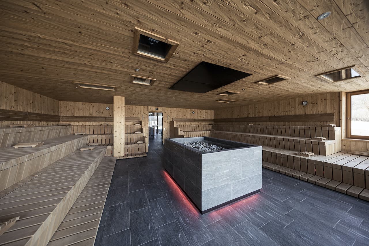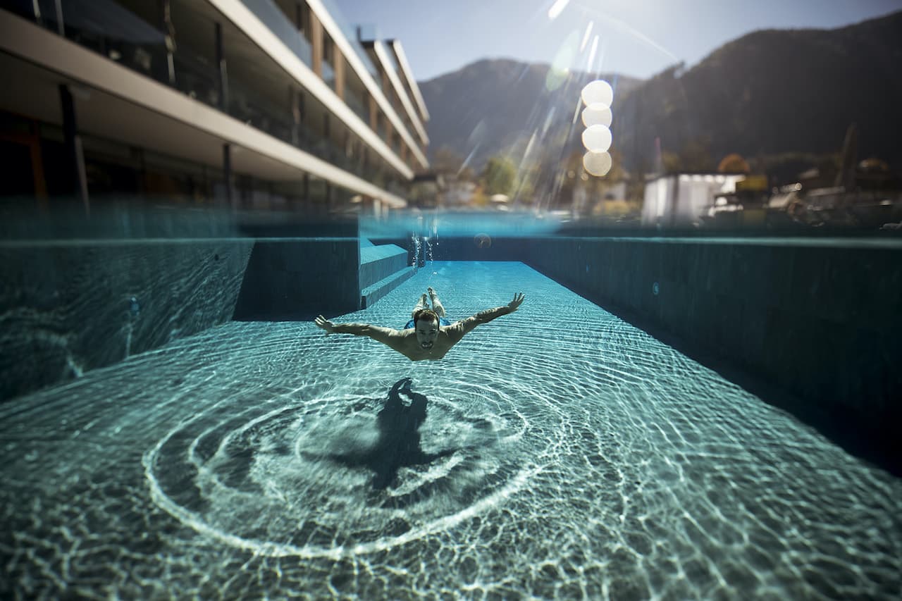 Per il riposo dopo gli aufguss, la scelta è ampia: si può optare per le diverse sale relax all’interno della spa, come i lettini ad acqua oppure la suggestiva area “water shadow” con un gioco di luci creato dall’acqua che illumina le pareti, oppure scoprire la sala “salt & infrared” (sdraiandosi sui lettini gli infrarossi si accendono e scaldano la schiena) con le decorazioni di sale che creano un ambiente ovattato. O ancora provare i lettini sospesi, posti davanti alla grande vasca idromassaggio con vista sulle montagne, il cui leggero dondolio diventa una ninna nanna per prendere sonno più facilmente. Oltre alla piscina sul tetto, una grande piscina interna/esterna e un grande idromassaggio all’aperto sono un’invitante proposta di benessere.
