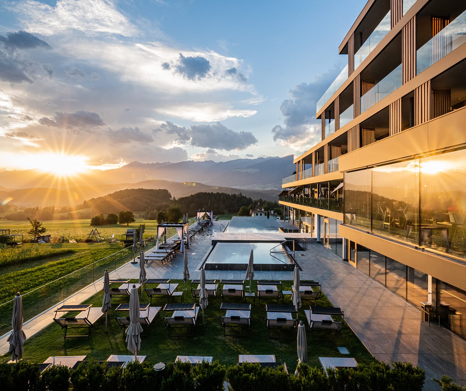 L’altro modo per toccare il cielo con un dito è immergersi nell’infinity pool panoramica posizionata sul tetto. Una location che affascina gli ospiti che desiderano galleggiare nell’acqua tiepida davanti ad un paesaggio strabiliante: la val Pusteria è “ai propri piedi”. La vista è impagabile. In ascensore, si sale sul tetto, al 4° piano e lo sguardo si posa sulle vette delle montagne e i loro verdissimi pendii. In questo luogo speciale, dedicato solo agli adulti, la calma è garantita. Questa stupenda piscina a sfioro, depurata con ozono, sembra non avere confini. L’acqua sfiora il bordo confondendosi con l’azzurro del cielo. Si nuota in una dimensione onirica: non ci sono pareti che interrompono il panorama. Per chi si vuole letteralmente sdraiarsi, c’è un tiepido idromassaggio che invita al relax (panoramico) completo. Lettini e chaise longue sulla grande terrazza permettono di dormire, riposare, sognare, abbronzarsi o dimenticare la quotidianità. Qui, il cielo è ancora più vicino.