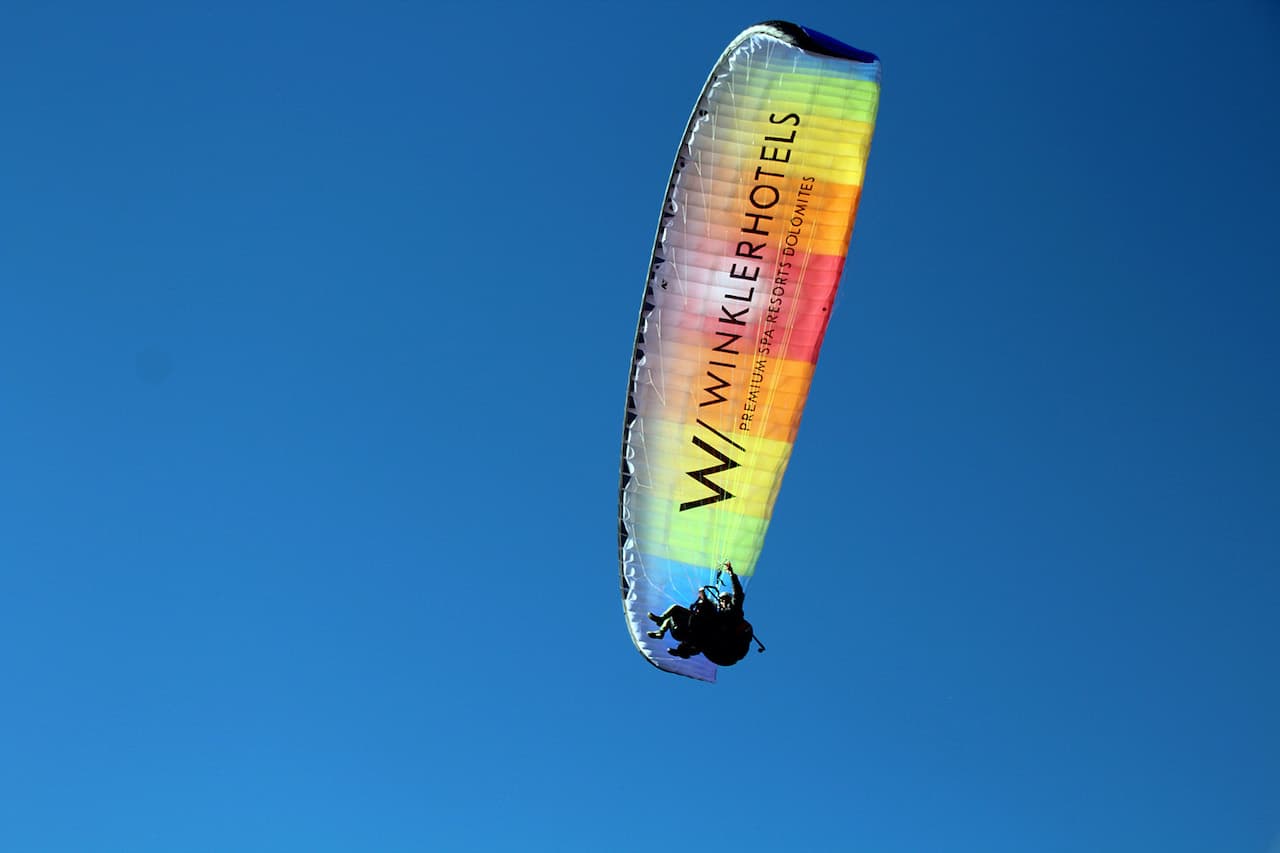 L’hotel Winkler è un luogo straordinario dove vivere una vacanza al settimo cielo. E non è un modo di dire. Quest’estate, il cielo è raggiungibile in due modi: dalla favolosa infinity pool sul tetto, dove sembra di toccare il cielo con un dito e dal parapendio che fa battere il cuore dal decollo fino all’atterraggio. Infatti, il colorato parapendio firmato Winkler e l’istruttore Martin attendono gli ospiti per un indimenticabile giro al cospetto delle cime alpine. Si parte dalla vetta del Plan de Corones e ci si lascia “trasportare” dalle correnti ascensionali.